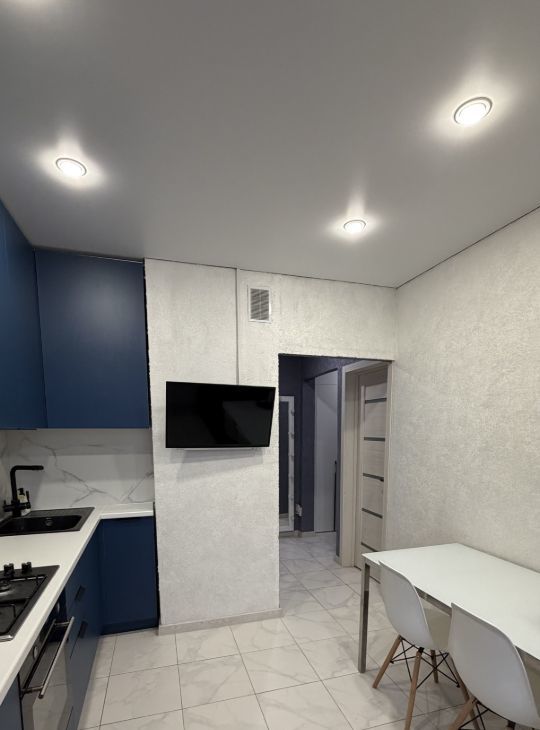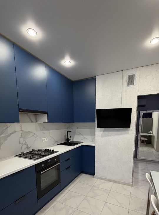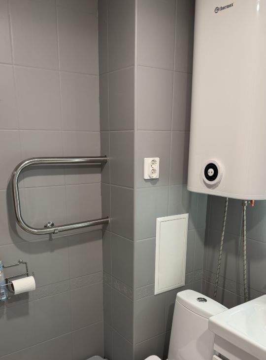 Кухня оборудована стильной мебелью и газовой плитой, создавая идеальные условия для кулинарных экспериментов. Санузел совмещенный, выполнен в современном стиле с качественной сантехникой.