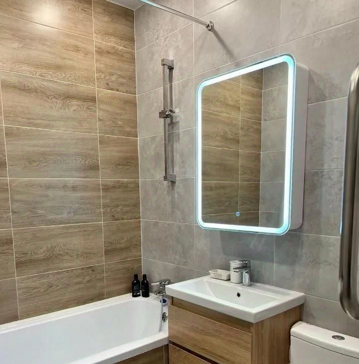 В квартире выполнен дизайнерский ремонт, что создаёт уютную и современную атмосферу. Мебель на кухне и в комнате подобрана с учётом эргономики и стиля. Для вашего комфорта в квартире есть вся необходимая техника: кондиционер, холодильник, посудомоечная машина, телевизор и стиральная машина. Ванная комната оборудована ванной, что позволяет расслабиться после долгого дня.