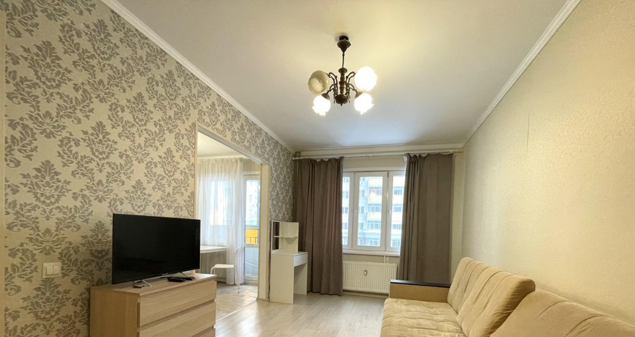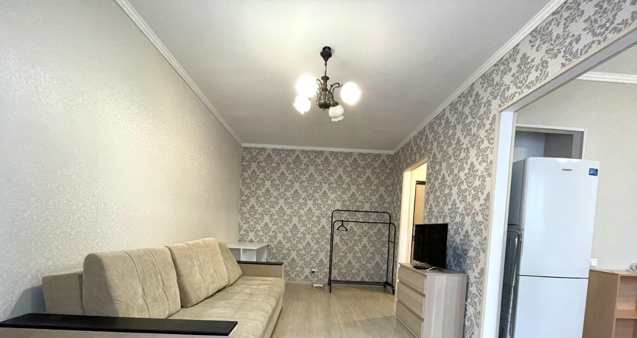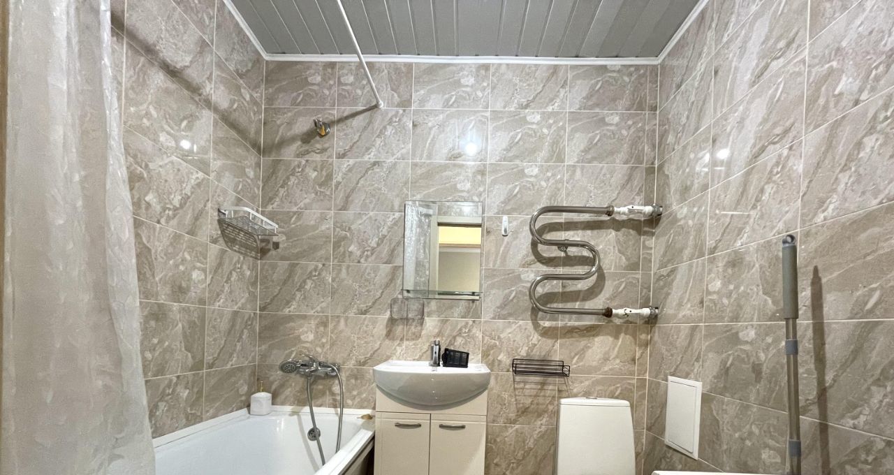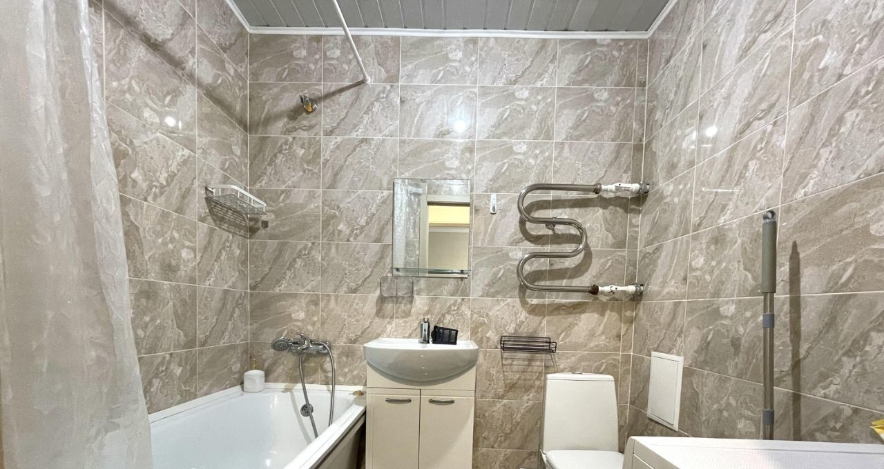 Квартира с современным ремонтом и полностью обставлена мебелью. В кухне площадью 7 кв. м есть всё необходимое: холодильник и мебель, чтобы комфортно готовить и принимать пищу. В комнате — мебель для отдыха и сна, а также телевизор. В совмещённом санузле установлена ванна и стиральная машина, что обеспечивает удобство в быту.