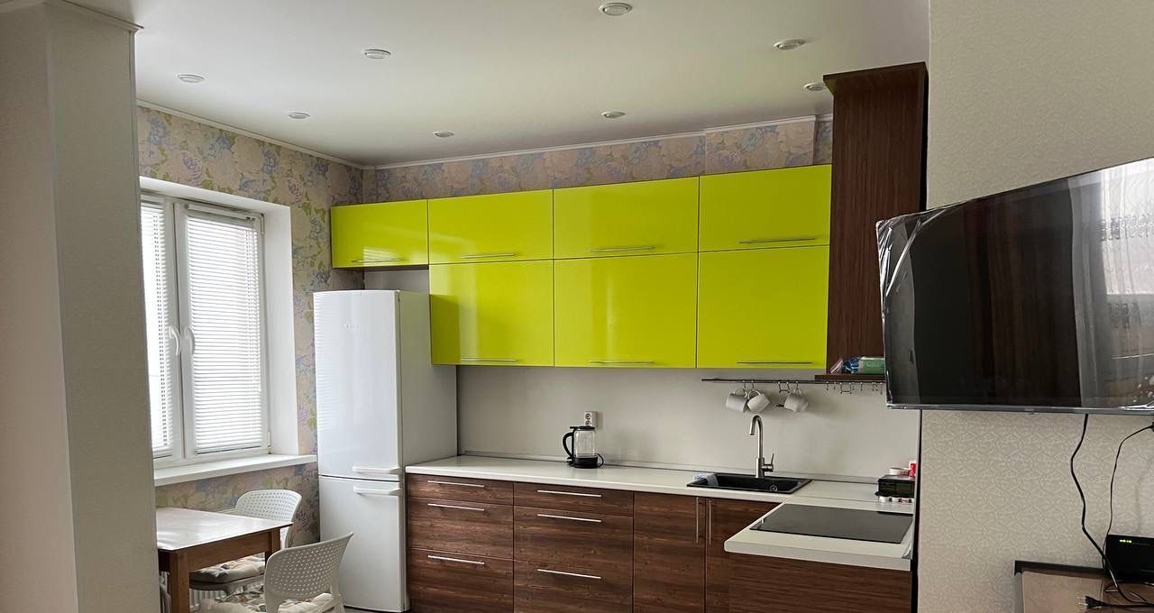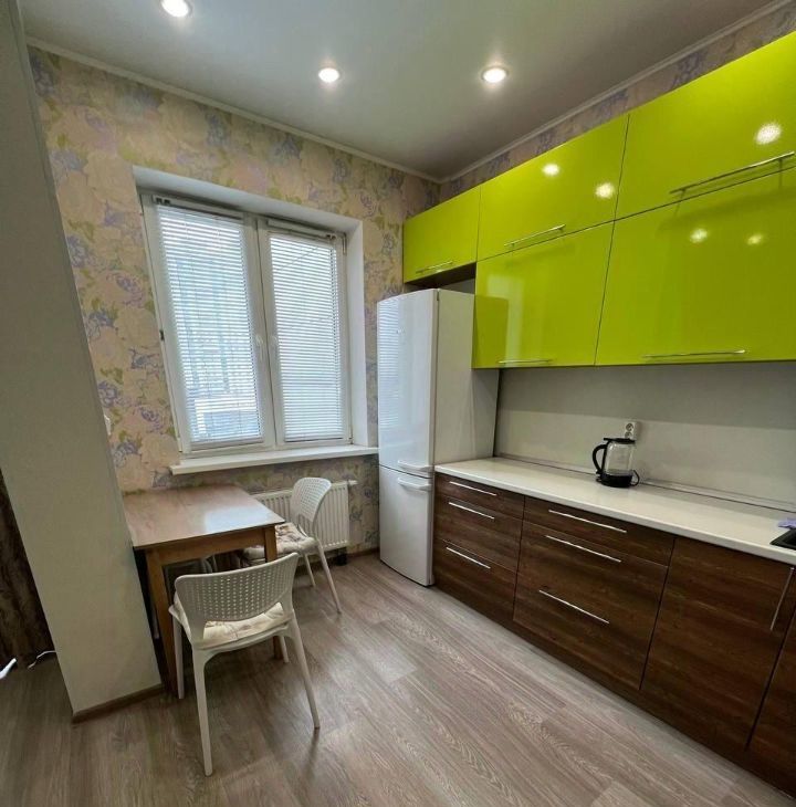 Оборудовaнная кухня: вместительный кухонный гарнитур, хoлoдильник, индукционная плита, микроволновая печь, духовой шкаф (- Bosch), электрический чайник, микроволновая печь, стол и 4 стула.