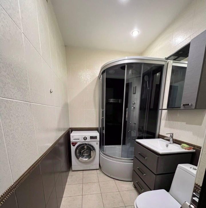 Очень просторный санузел, в котором установлены душевая кабина, туалет, стиральная машина и необходимая мебель для ванной комнаты.