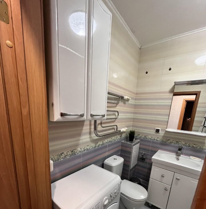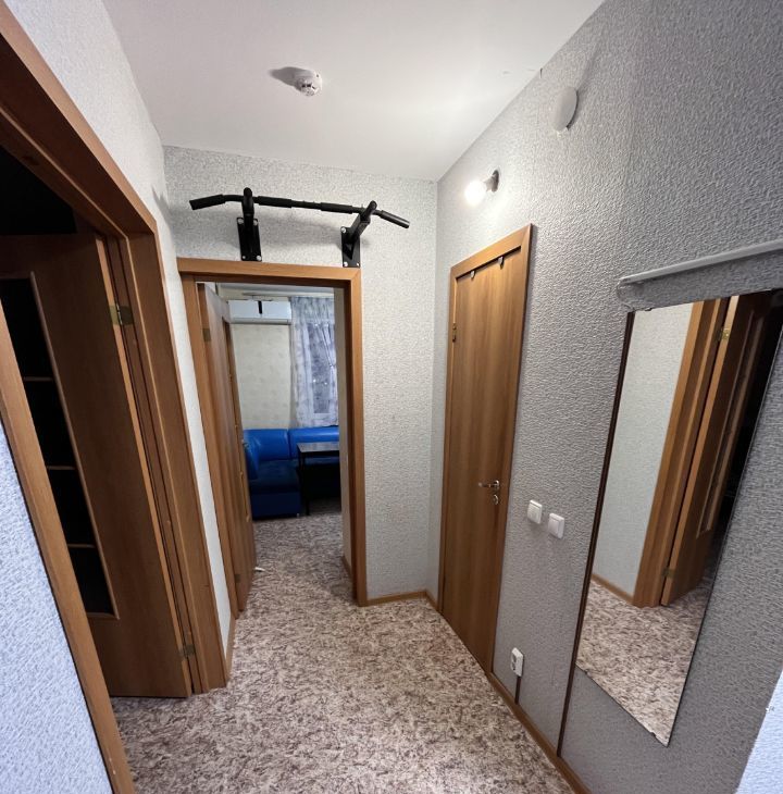 В квартире есть все необходимое для комфортного проживания. Кухня оснащена мебелью и техникой, включая холодильник и кондиционер. В квартире также есть мебель, телевизор и стиральная машина, пылесос, просторный шкаф в комнате, турник в коридоре. Санузел совмещенный. Кладовка оборудована полками для хранения.