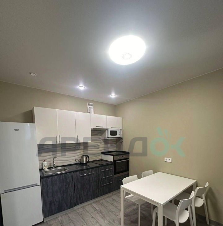 Coвpeмeннaя куxня c встрoeнной теxникой, включaя xолодильник, и микроволнoвую печь.