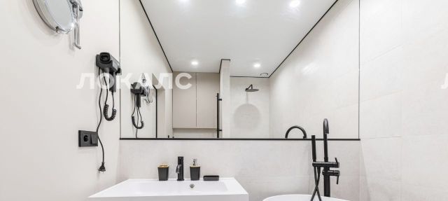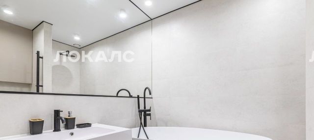 В санузле установлена сантехника из литьевого мрамора - отдельно стоящая ванна, раковина. Есть также просторная душевая зона. Для удобства и комфорта установлены теплый пол, подсветка, зеркало в пол стены, встроенное раскладное зеркало для макияжа/бритья, встроенный фен, электрический полотенцесушиель, подвесной унитаз над которым расположена закрытая система хранения.