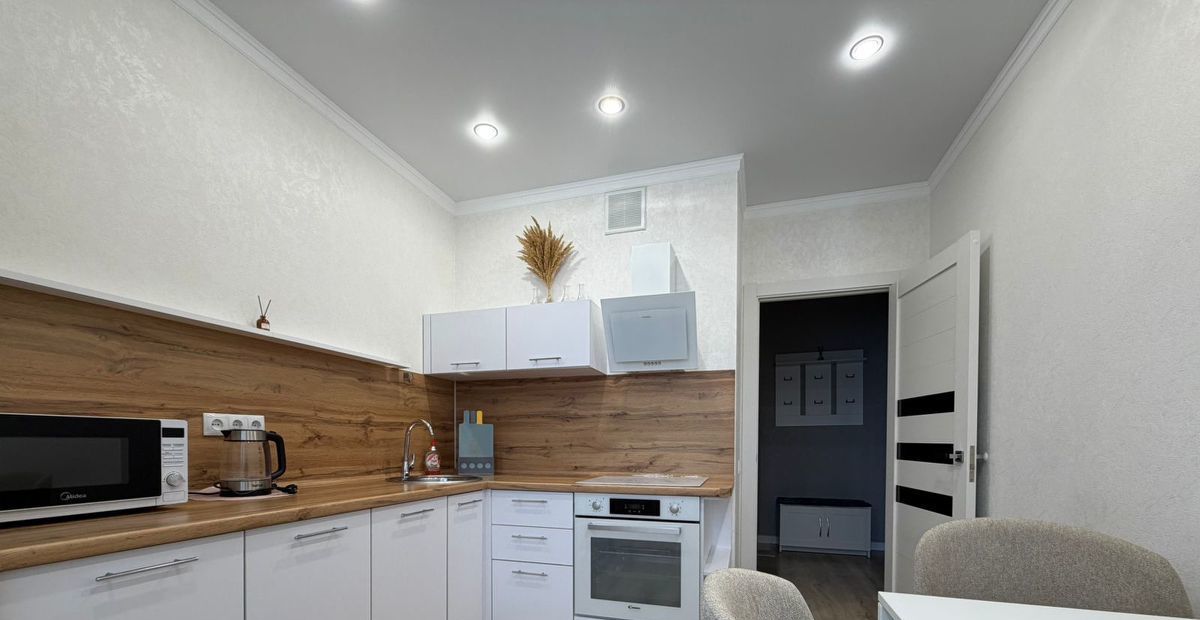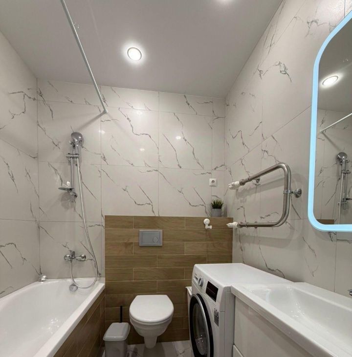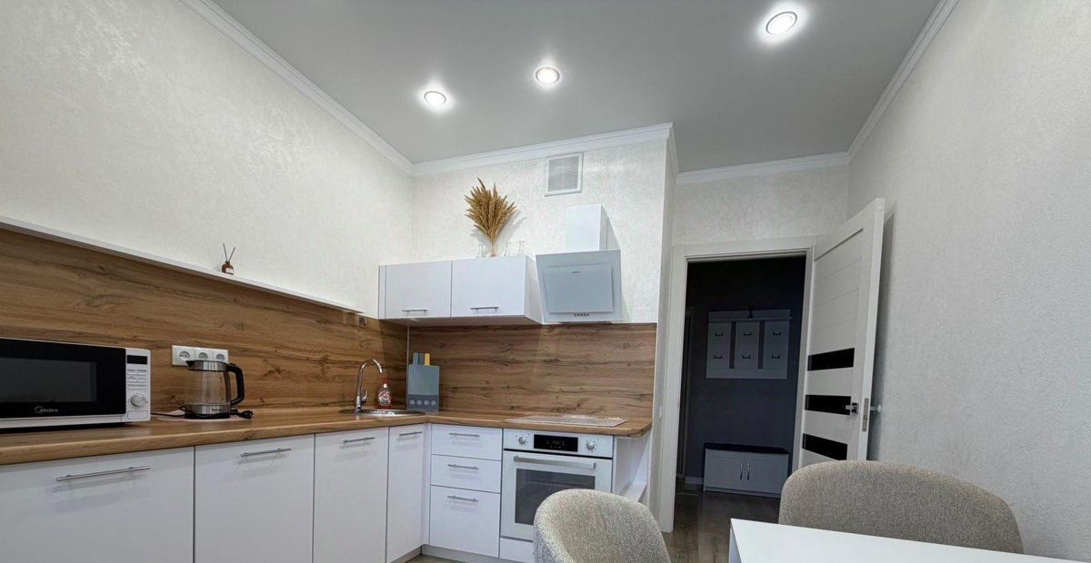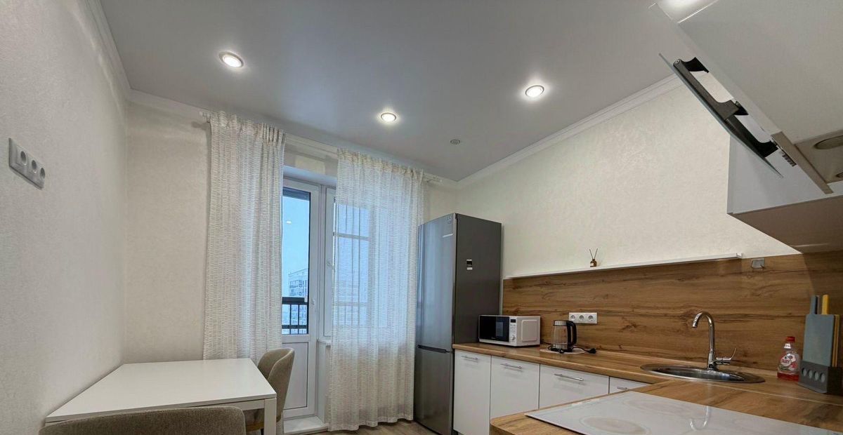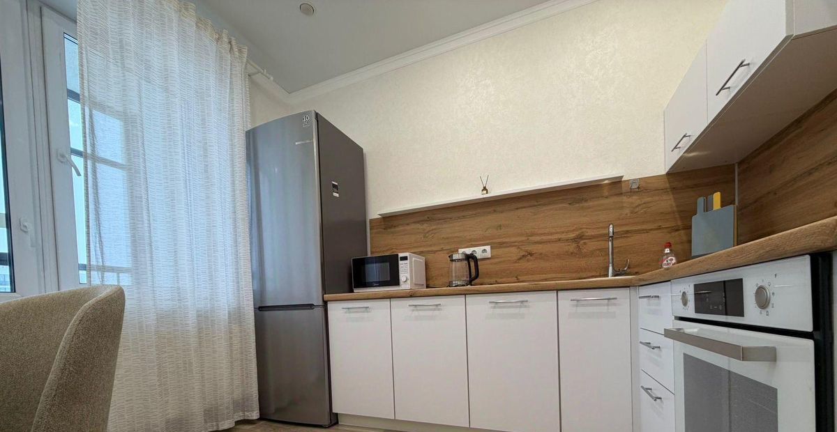 Квартира с ремонтом в современном стиле, полностью меблирована и готова к заселению. В просторной комнате есть удобная кровать, шкаф для одежды и уютный уголок для отдыха. Кухня оборудована всей необходимой техникой, включая холодильник, плиту и микроволновую печь, поэтому можно сразу заняться готовкой. Санузел совмещенный, с качественной сантехникой.