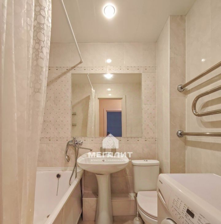 Санузел в плитке имеется стиральная машина и большое зеркало.