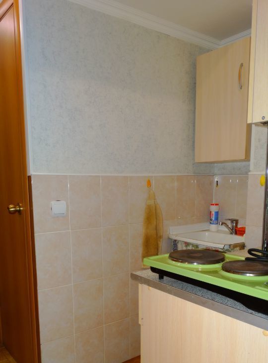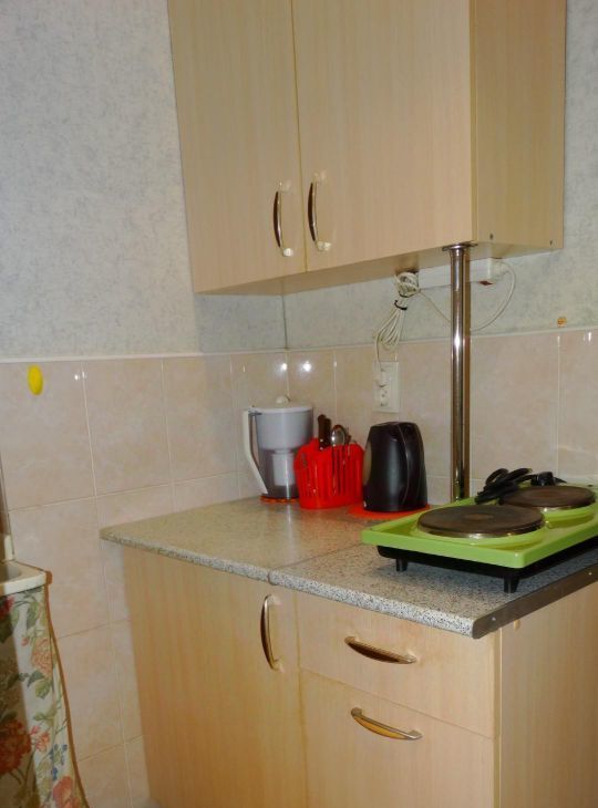 В квартире сделан косметический ремонт. Комната оснащена необходимой мебелью, из техники: холодильник, чайник, микроволновка, электрическая плитка, телевизор.