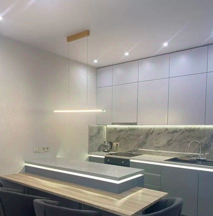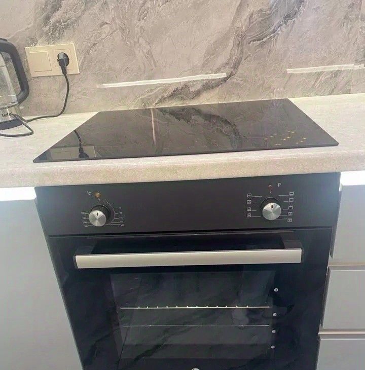 •большая кухня с холодильником, варочной панелью, вытяжкой, микроволновой печью и электрочайником, посудомоечная машина.