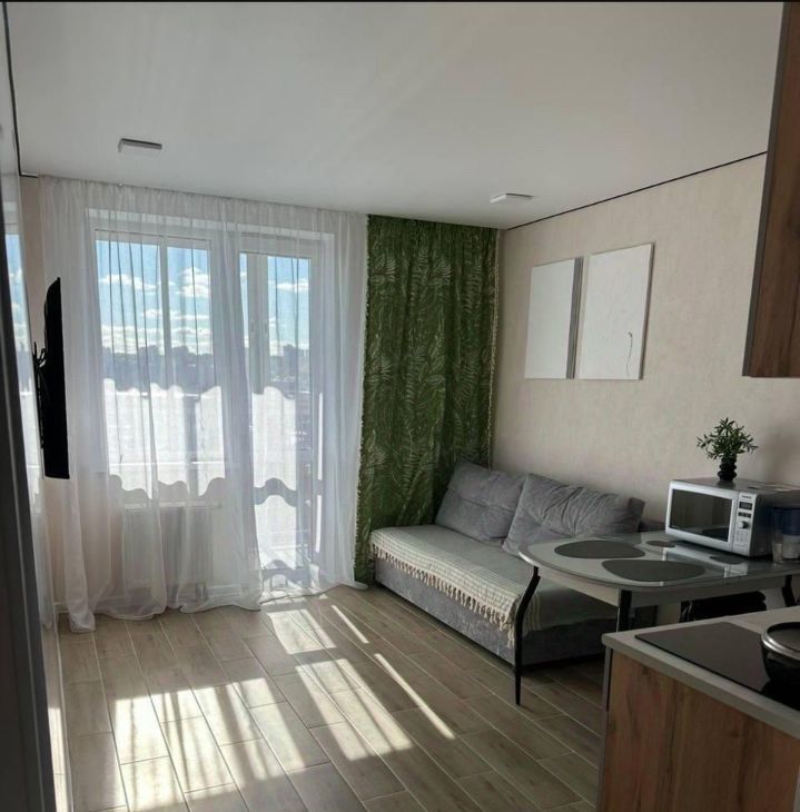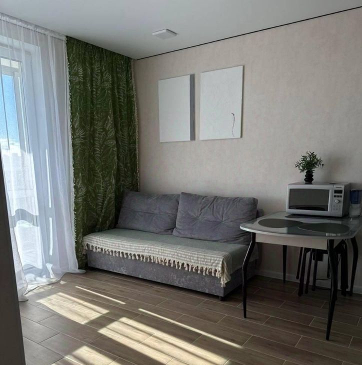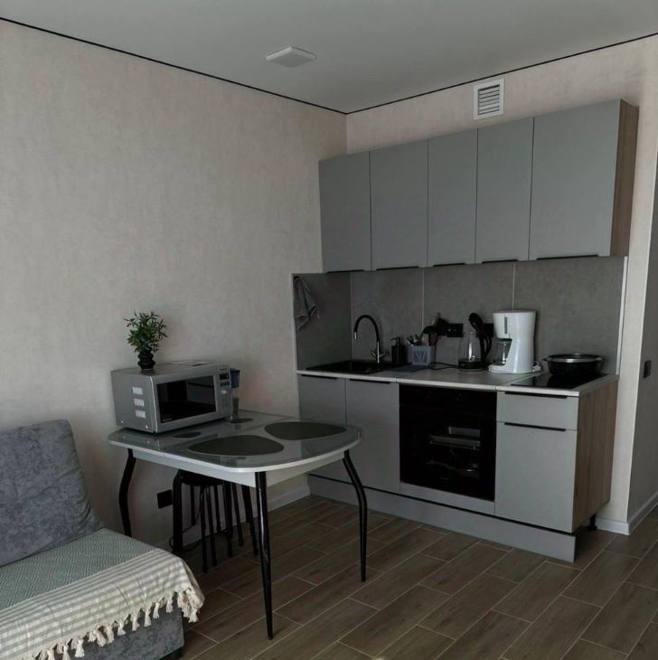 Сдаётся стильная однокомнатная квартира евродвушка в новом доме на улице Архитектора Гайнутдинова, 26к6 в Казани. Общая площадь квартиры составляет 39 кв. м, из которых 11 кв. м отведено под жилую зону и 13 кв. м под кухню-гостиную, где имеется еще одно спальное место. Квартира расположена на 11 этаже 19-этажного дома, построенного в 2024 году, что обеспечивает великолепные виды из окон и отсутствие шума.