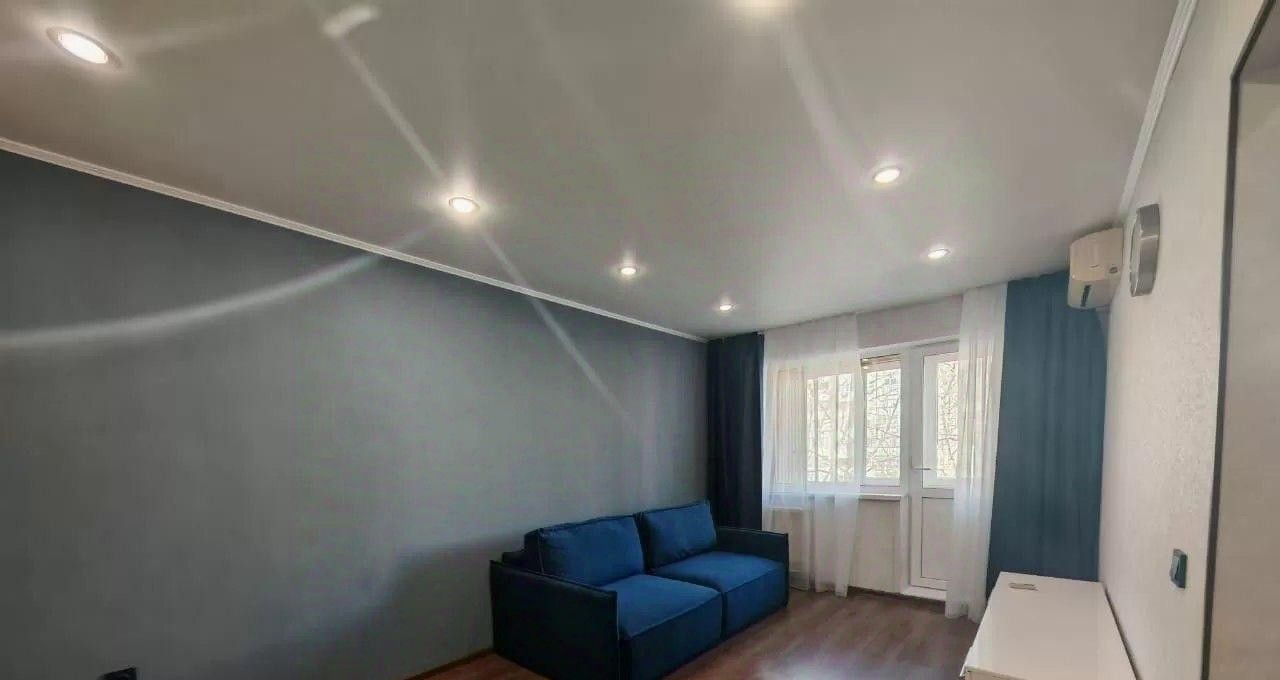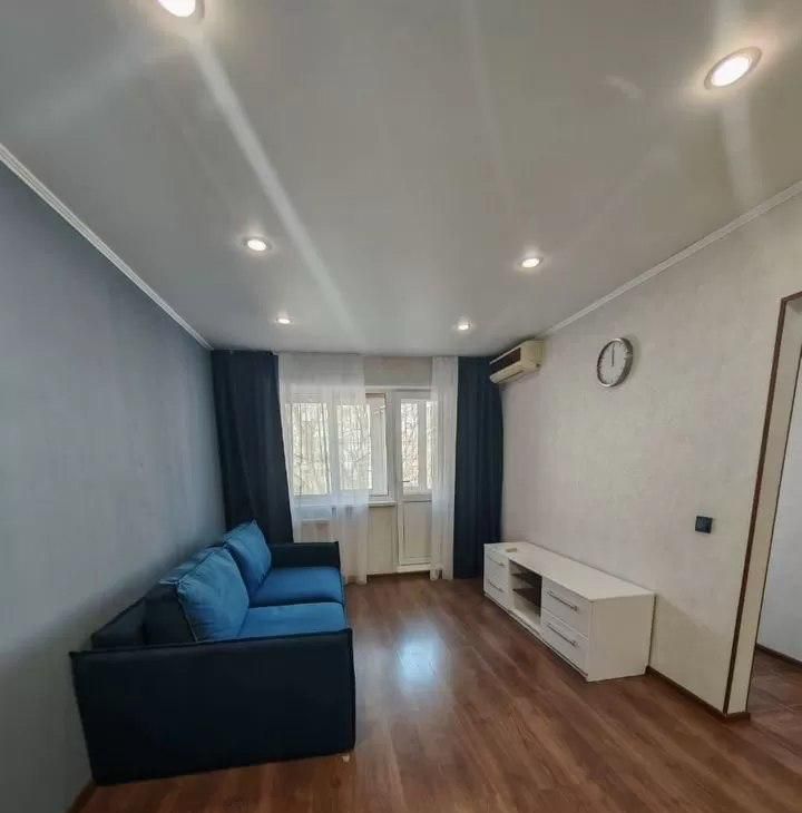 В квартире сделан качественный ремонт: светлые стены и ламинат создают атмосферу уюта и комфорта. Просторная комната обставлена современной мебелью, включая диван и шкаф. На кухне есть всё необходимое: кухонный гарнитур, плита и холодильник. Санузел совмещённый, в нём установлена новая сантехника.