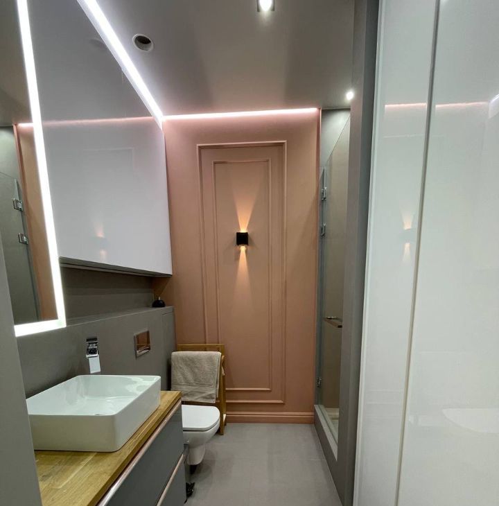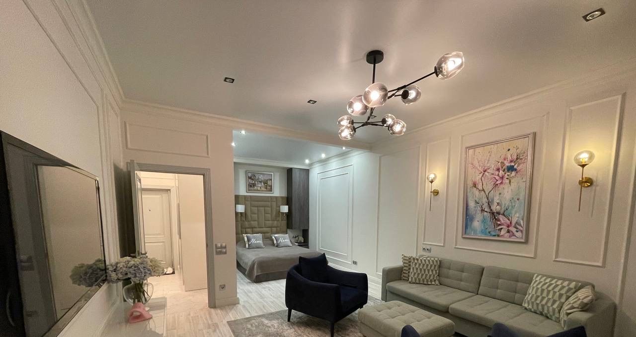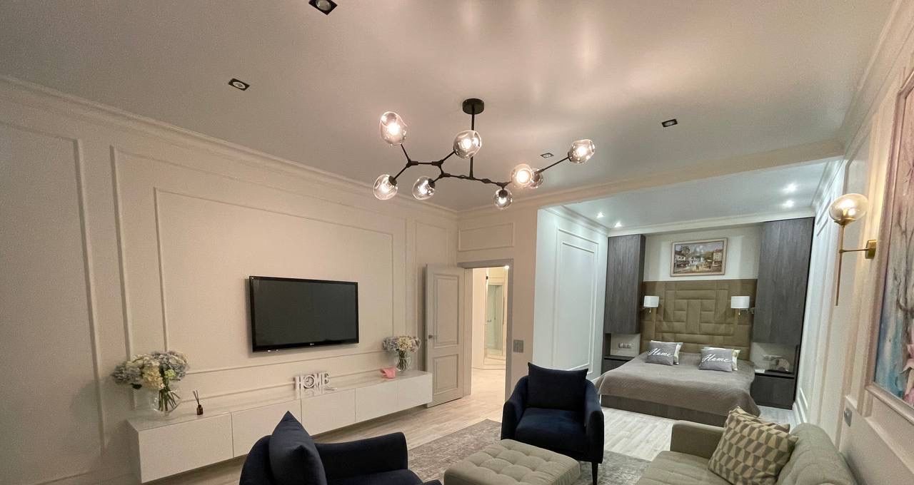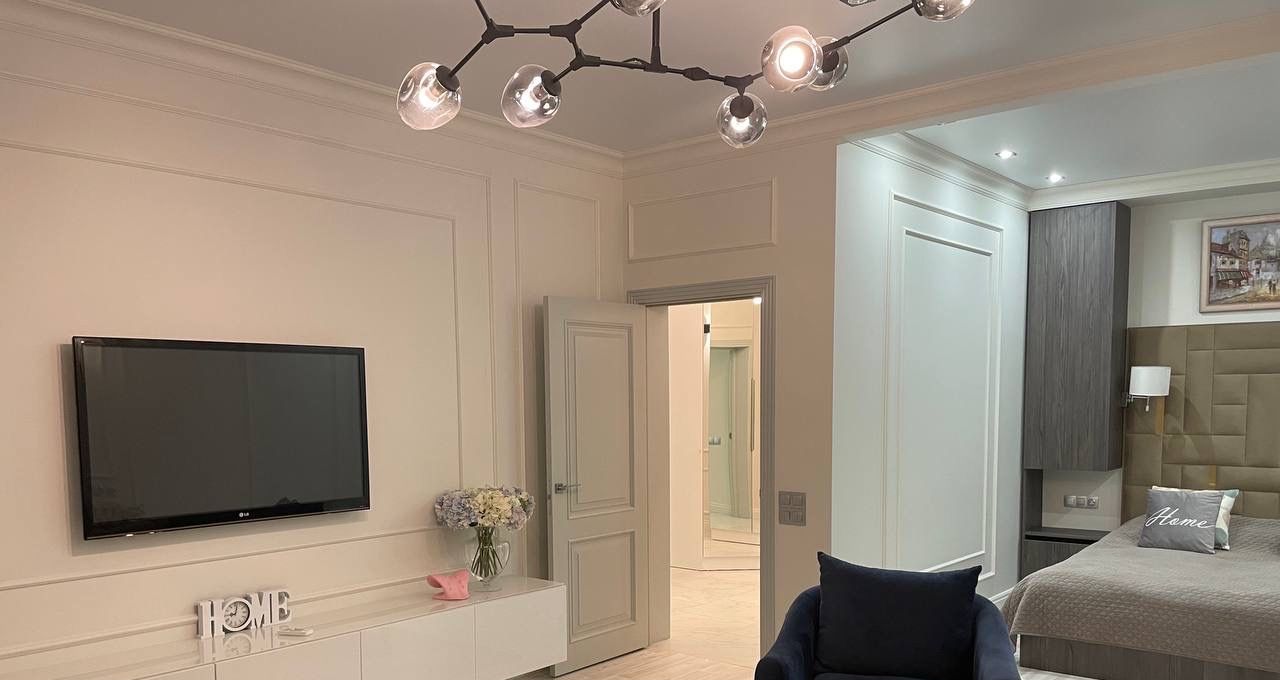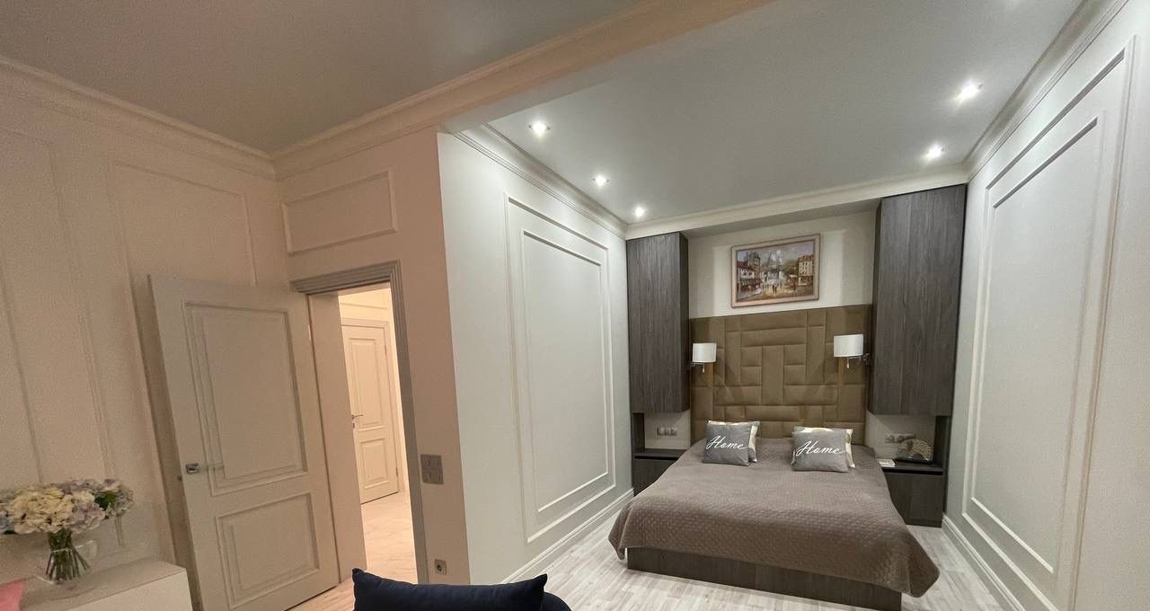 В спальне большая кровать и вместительные шкафы. Санузел совмещенный, оформлен в современном стиле с качественной сантехникой. В квартире есть кабельное/цифровое ТВ.