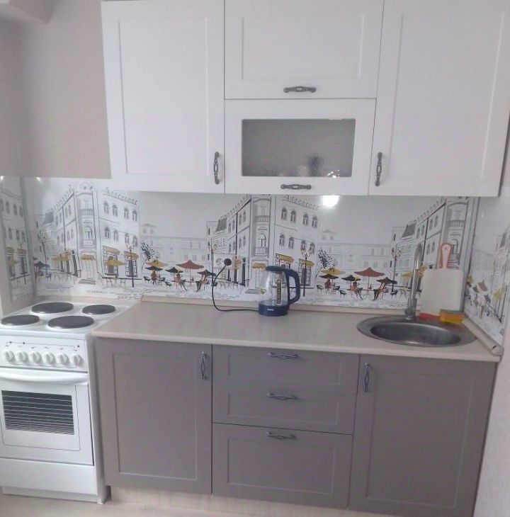 Кухня: кухонный гарнитур, электроплита на 4 конфорки с духовкой, холодильник, микроволновка, стол, стулья, диван, чайник, посуда (кастрюли, сковородки, столовые приборы и пр.) для приготовления пищи.