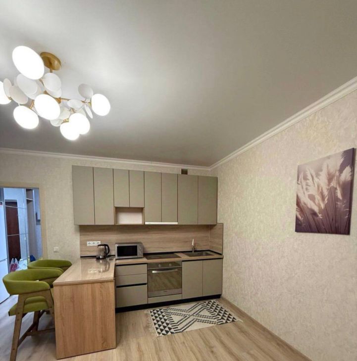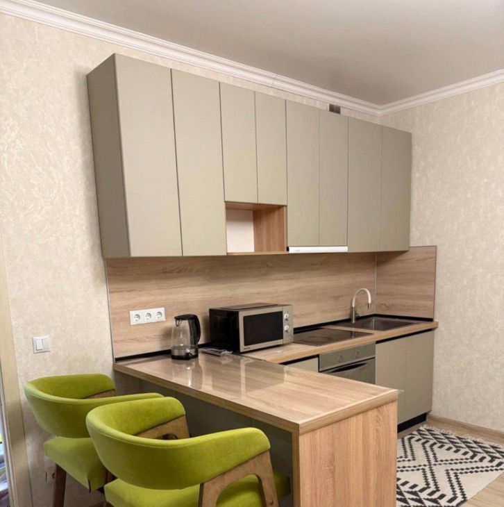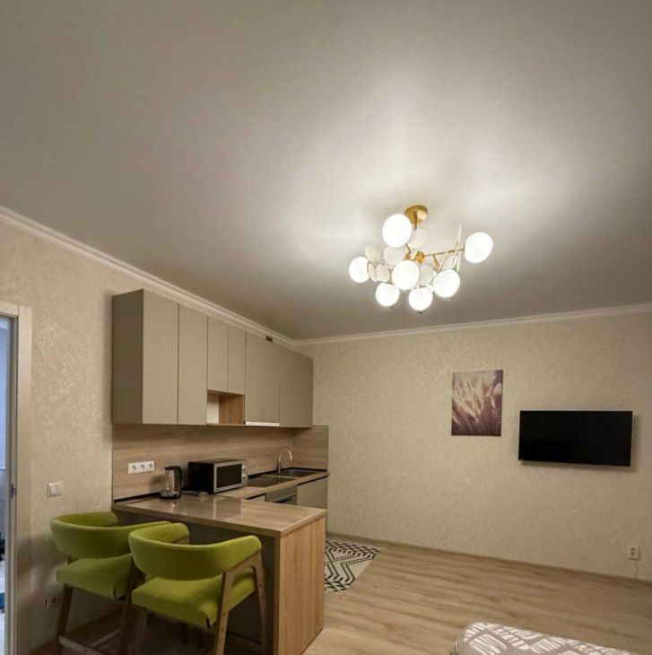 В квартире выполнен евроремонт. Просторная кухня площадью 10 кв. м оснащена всей необходимой мебелью и техникой, включая холодильник. В комнате также есть мебель, телевизор и доступ к интернету. Ванная комната оборудована и душевой кабиной, и ванной. Окна квартиры выходят во двор, поэтому в квартире тихо и спокойно, а значит, можно наслаждаться отдыхом после рабочего дня.