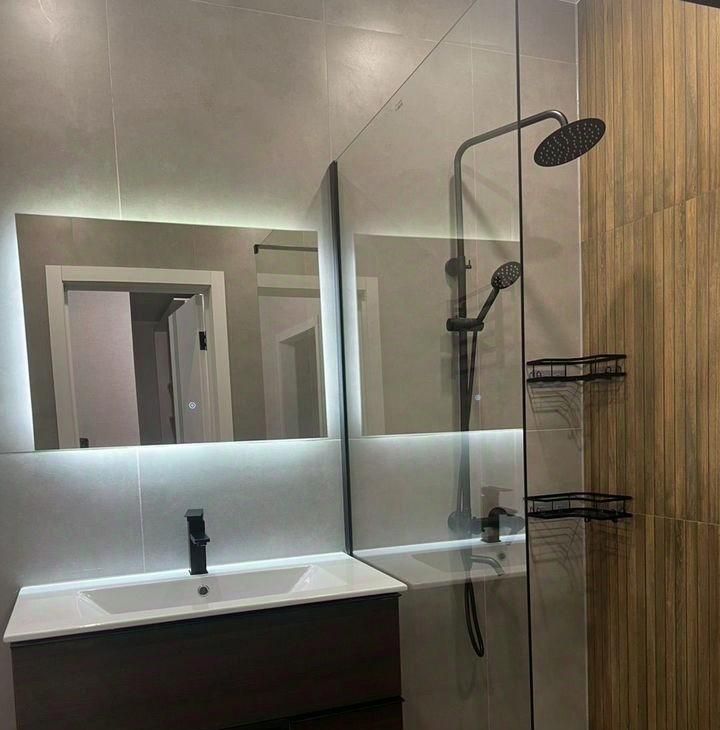 В квартире сделан качественный евроремонт. Просторная кухня оборудована всем необходимым: есть холодильник, посудомоечная машина и современная мебель. В комнате также установлена удобная мебель, а для вашего комфорта предусмотрены кондиционер и телевизор. В ванной комнате имеется душевая кабина и стиральная машина.