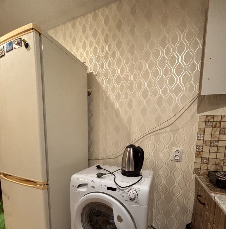 Кухня компактная,, есть все необходимое :холодильник, стиральная машина и микроволновая печь, электрическая плитка.