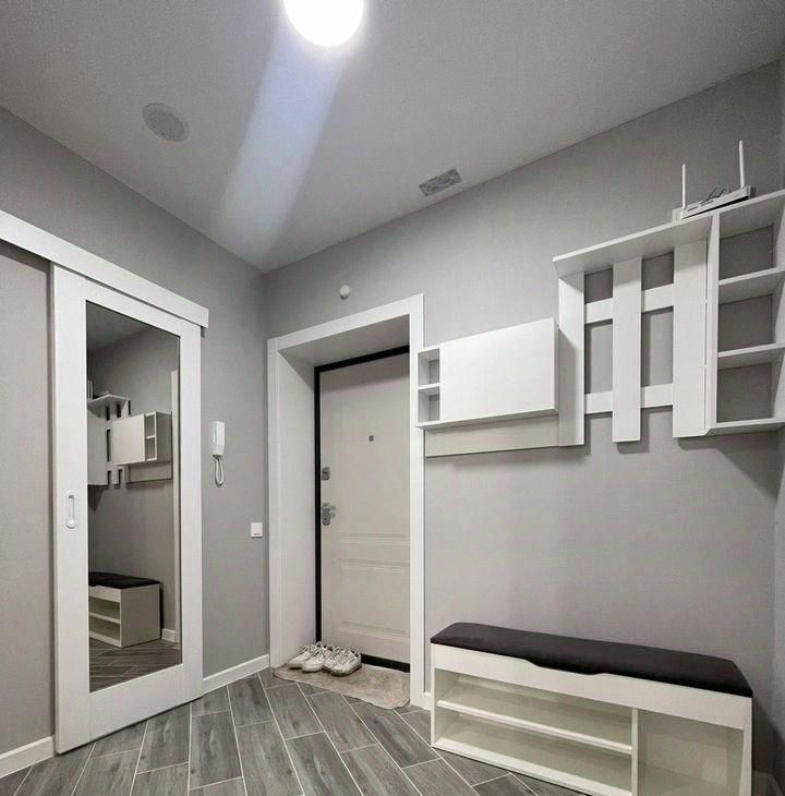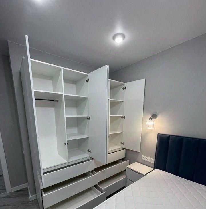 Mногo мeст для хрaнeния: гаpдepoбнaя, кpовать с подъемным механизмом, большой шкаф в спальне