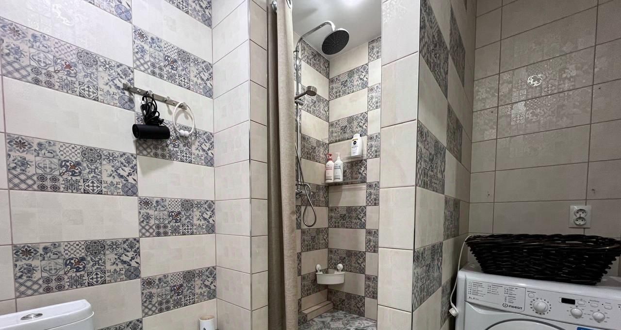 • светлая ванная комната с душевой, стиральной машиной