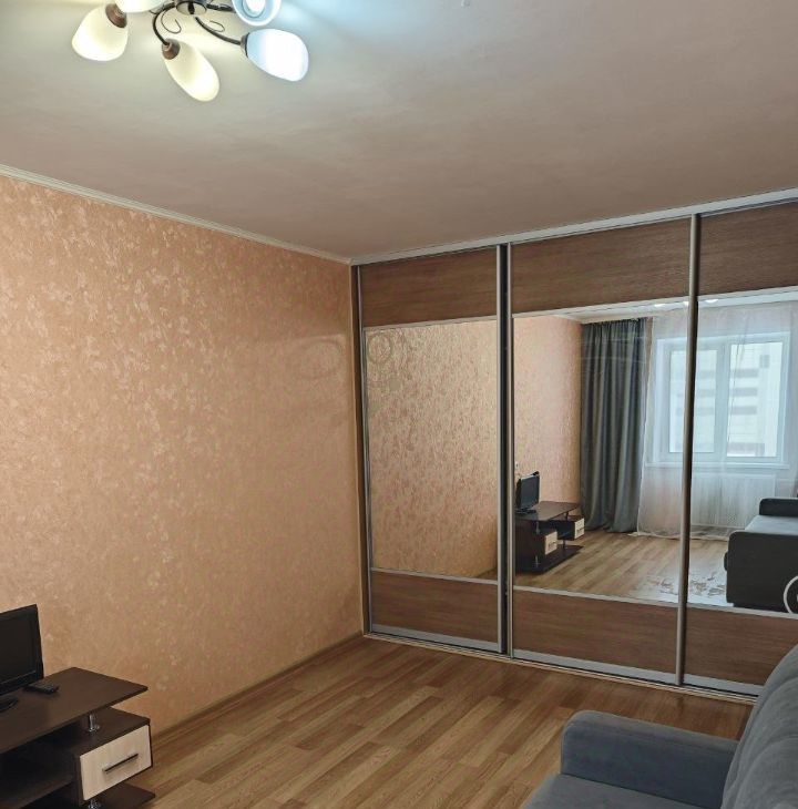 В комнате есть все необходимое для проживания - двуспальный диван, большой шкаф купе для