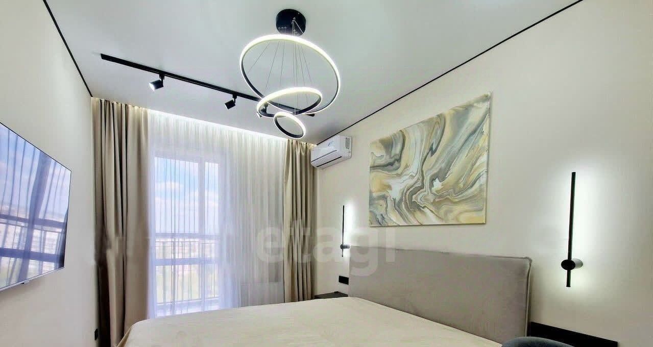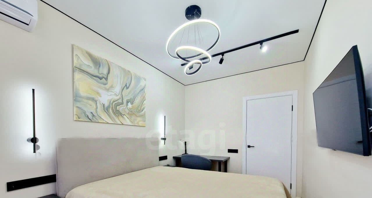 Спальня: мягкая, широкая двуспальная кровать с подъемным механизмом для хранения, прикроватные навесные тумбочки, рабочий стол со стулом, кондиционер и тв Sаmsung.