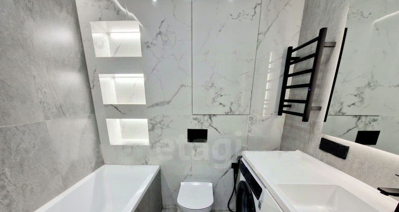 Ванная комната облицована керамогранитом Lараrеt с теплым полом, раковина со встроенной стиральной машиной LG, зеркало с подсветкой и обогревом, акриловая ванна, инсталляция ТЕСЕ, полотенцесушитель, вся сантехника черного цвета производства Италии. За люком скрытого монтажа установлен бойлер Еlесtrоluх на 50 литров.