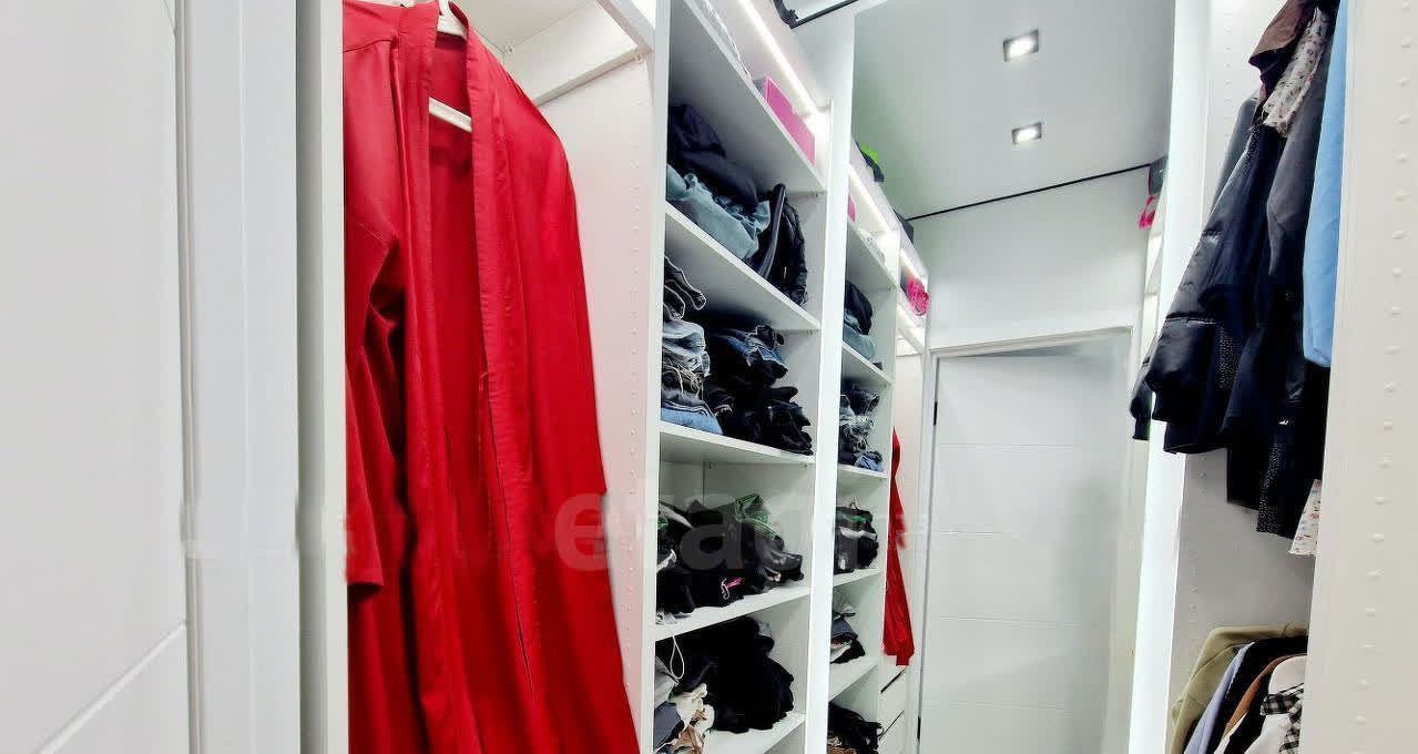 Просторная гардеробная с большим количеством выдвижных и открытых полок, а так же полка со стеклом для бижутерии и аксессуаров, зеркало с подсветкой до потолка.