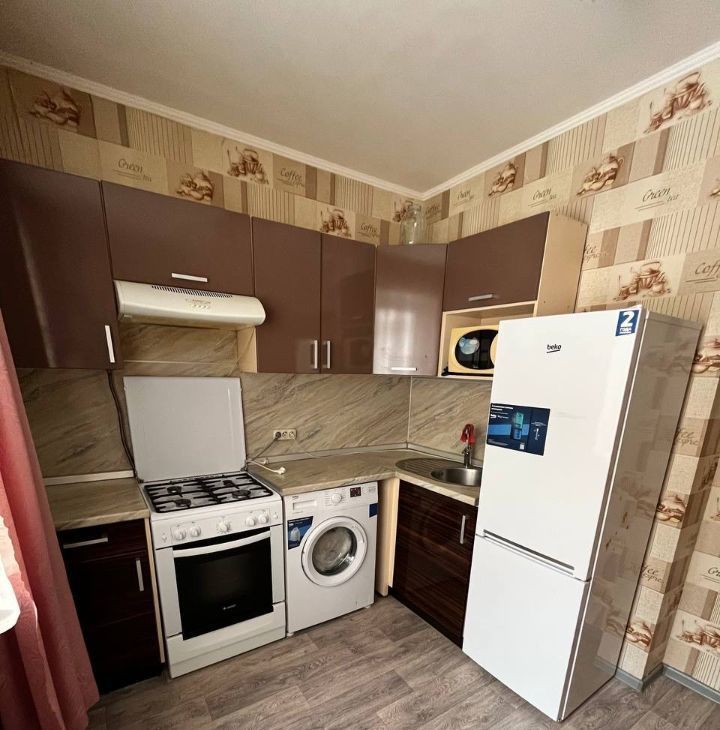 Квартира с косметическим ремонтом, в наличии всё необходимое для комфортного проживания. Есть мебель как в комнате, так и на кухне. Из техники — холодильник, телевизор и стиральная машина. Ванная комната оборудована ванной, санузел совмещённый. Балкон также имеется, что добавляет дополнительное пространство для отдыха.