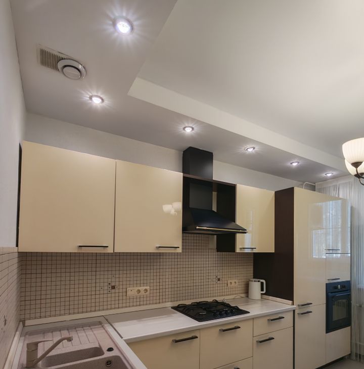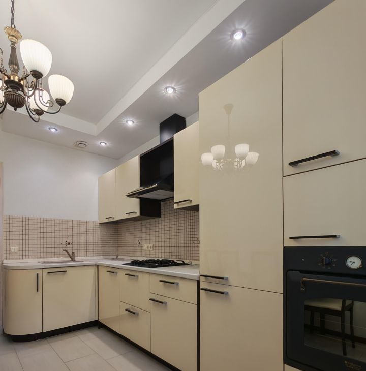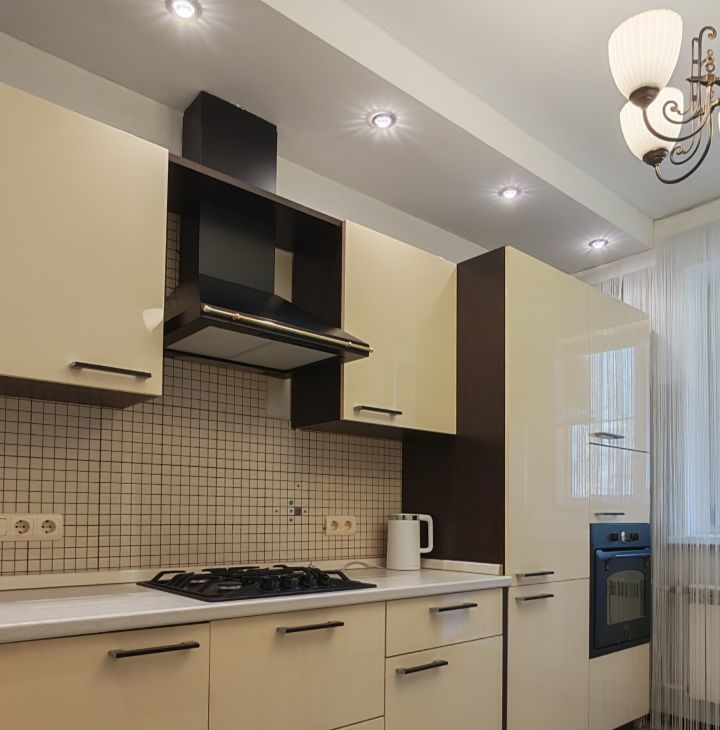 Кухонный гарнитур со встроенным холодильником, газовая плита, духовой шкаф электрический, вытяжка,