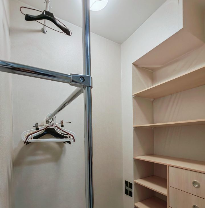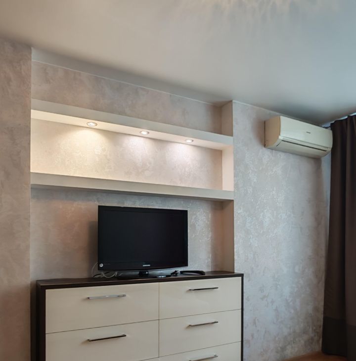 Кондиционер, раскладной диван, шкаф, комод, гардеробная.