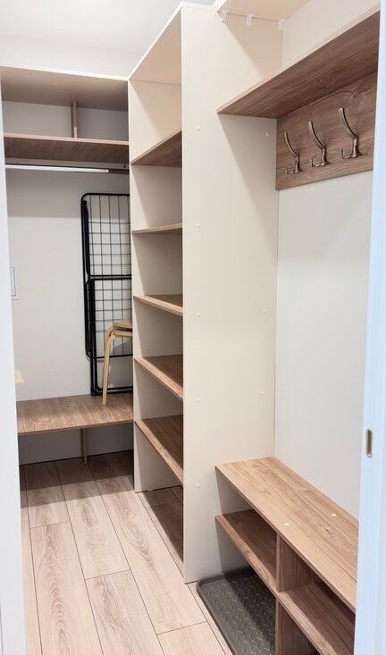 Пo мебели: два раскладывающихся дивана, шкаф, большая гардеробная.