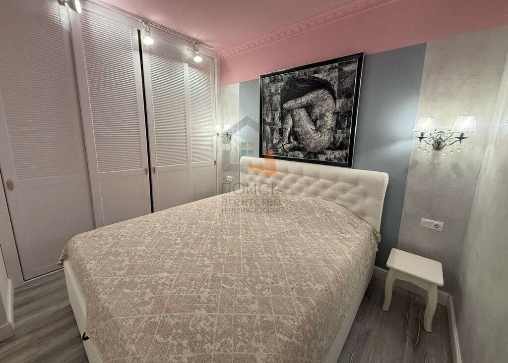 • Двуспальная кровать, вместительный шкаф, вся мебель в квартире из натурального дерева