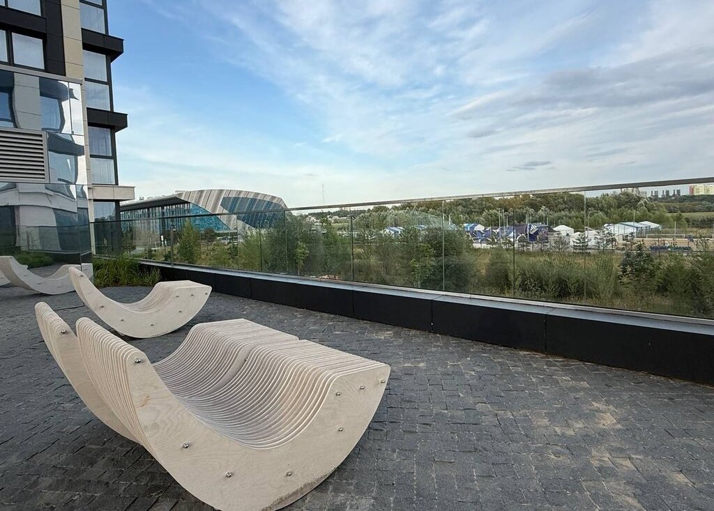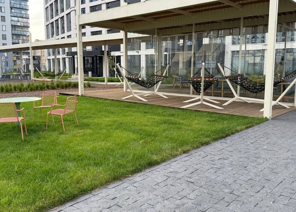 Современный и чистый подъезд с зонами отдыха, встречи гостей, переговорными комнатами, консьерж; просторный стилобат с множеством детских площадок для разного возраста, спортивными снаряжениями для детей и взрослых, волейбольной и баскетбольной площадками, настольным теннисом, волейбольной и баскетбольной площадками, настольным теннисом, уличной верандой, качелями, арт объектами, дизайнерски высаженными растениями, на первом этаже колясочная.