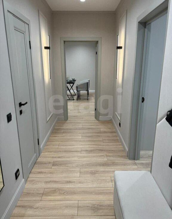 Просторная квартира сочетает в себе современный дизайн и функциональность. Здесь царит атмосфера уюта: мягкий диван, стильные кресла и оригинальные арт-объекты создают идеальное пространство для отдыха и встреч с друзьями.