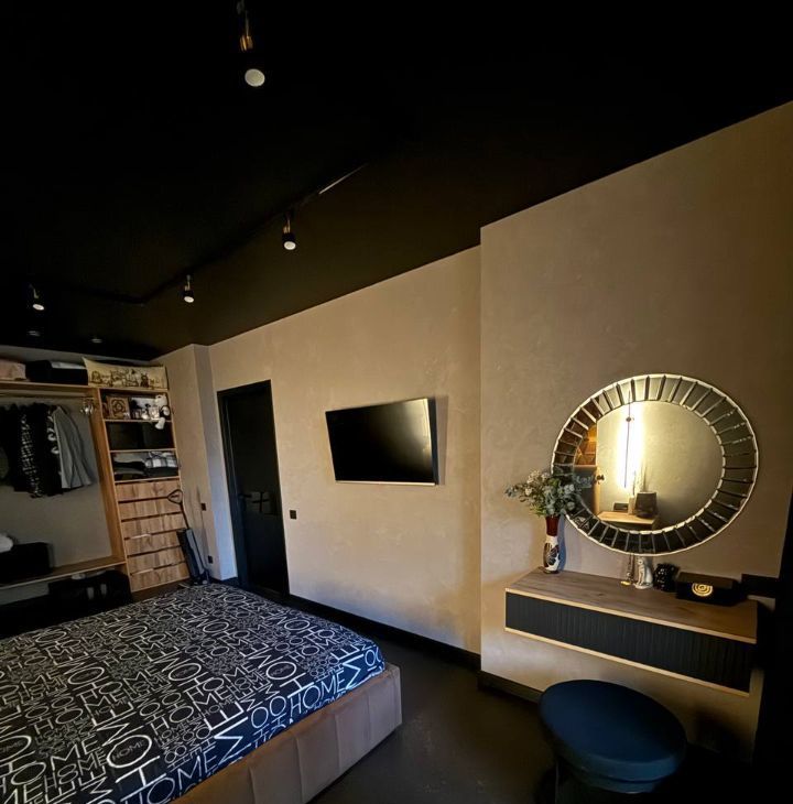 Стены покрыты декоративной штукатуркой арт бетон.