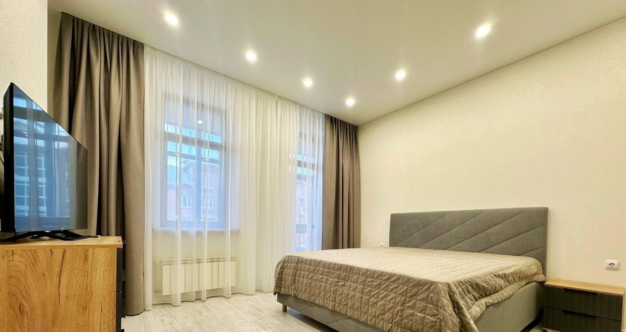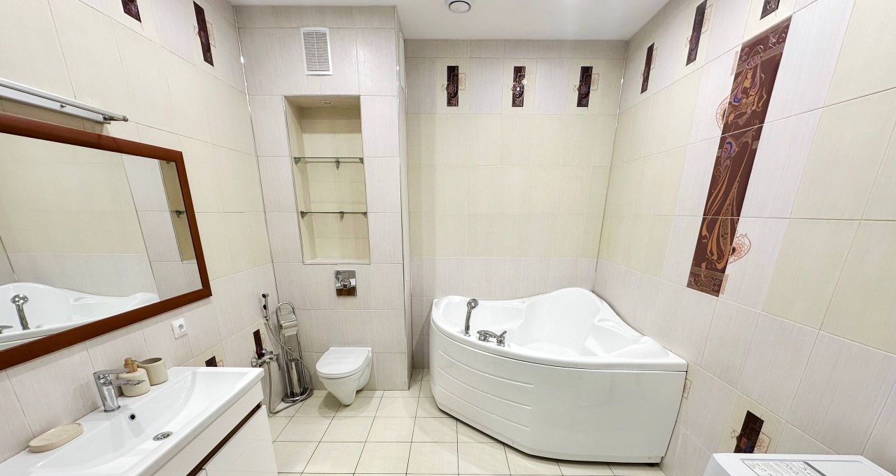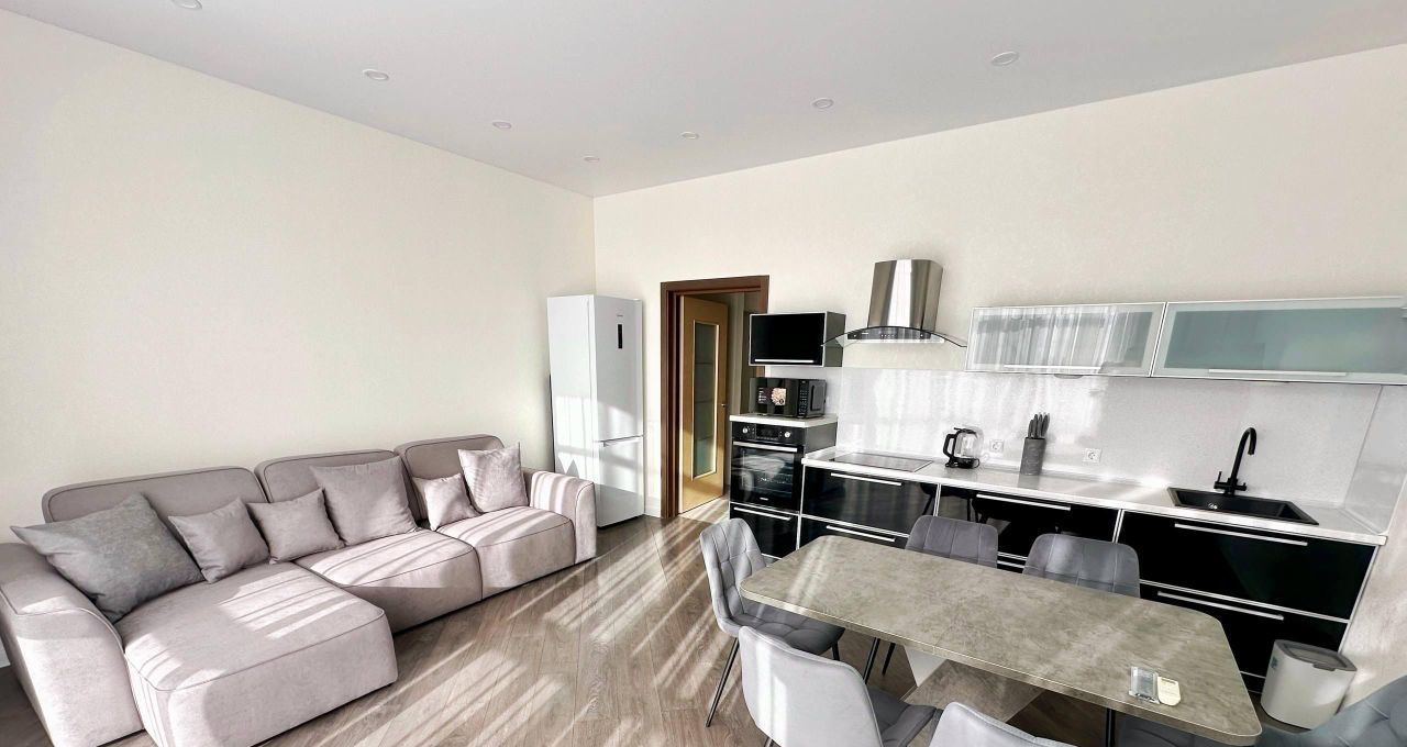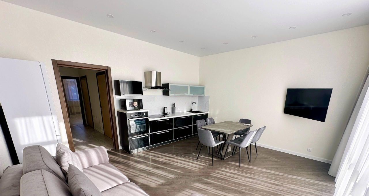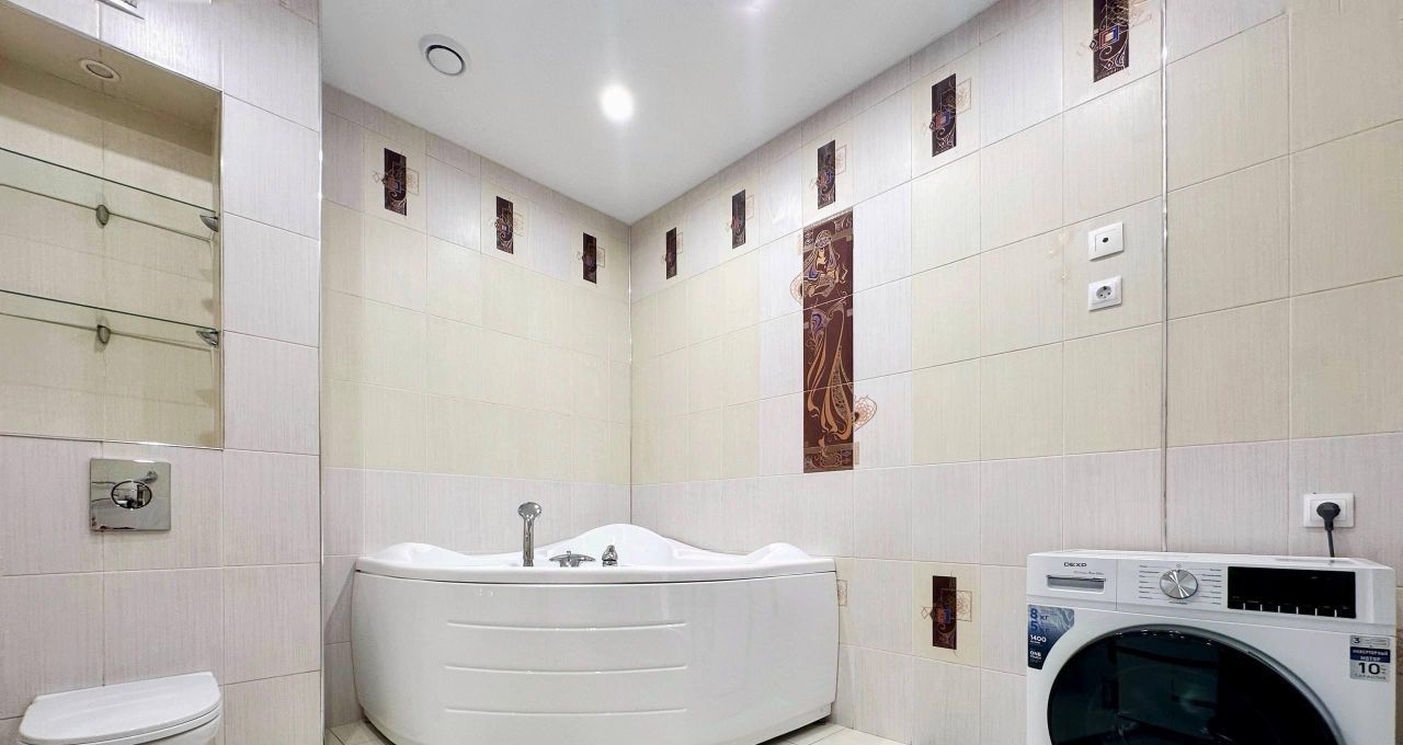 В квартире есть всё необходимое для комфортного проживания: кондиционер, холодильник, посудомоечная машина, телевизор и стиральная машина. Продуманная планировка включает совмещенный санузел с ванной и балкон с видом во двор. Мебель установлена как на кухне, так и в комнате, обеспечивая уют и удобство.