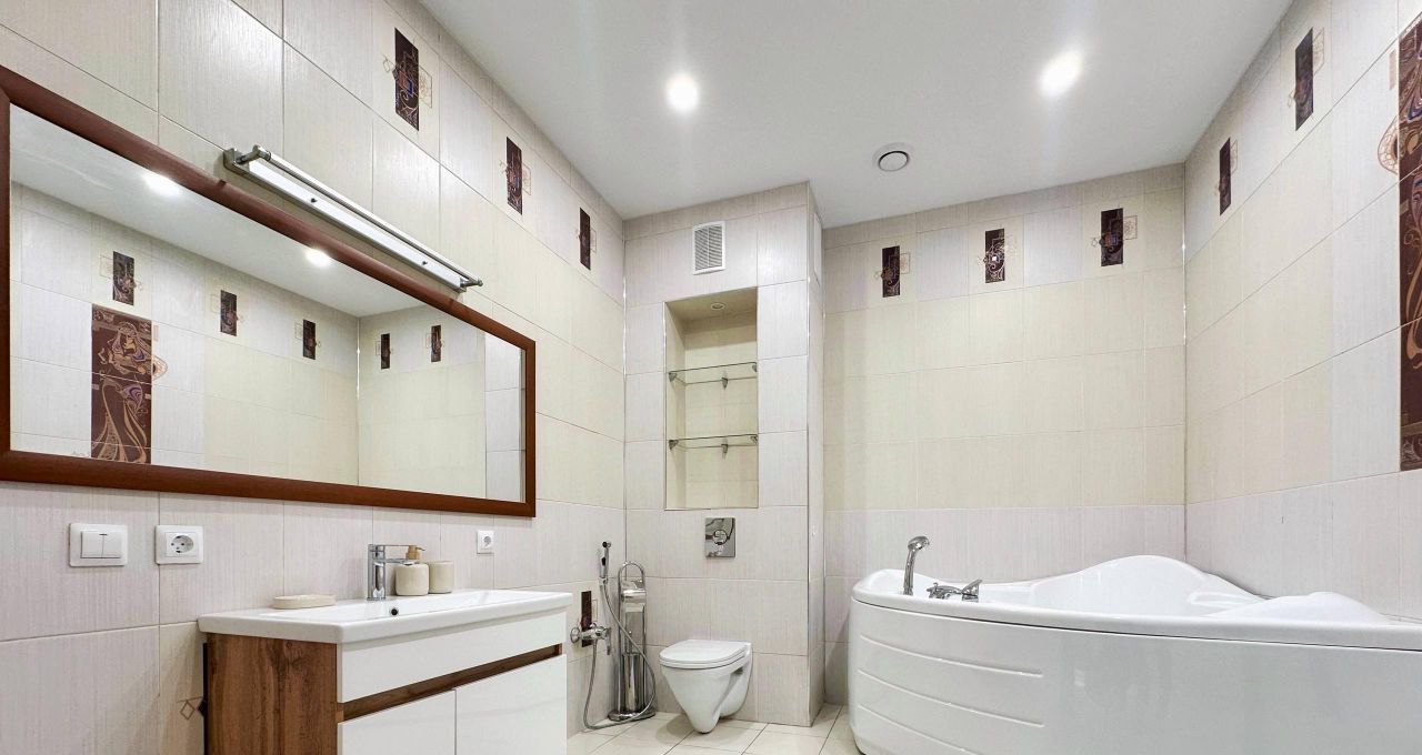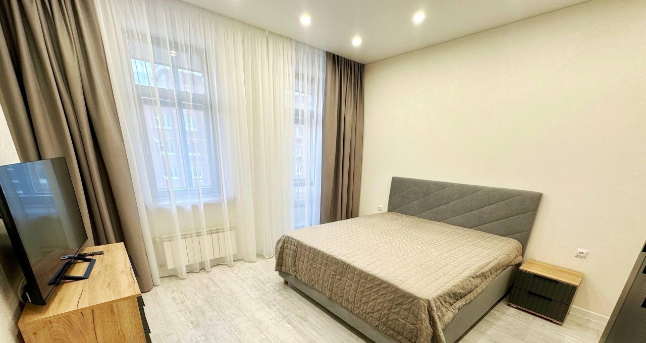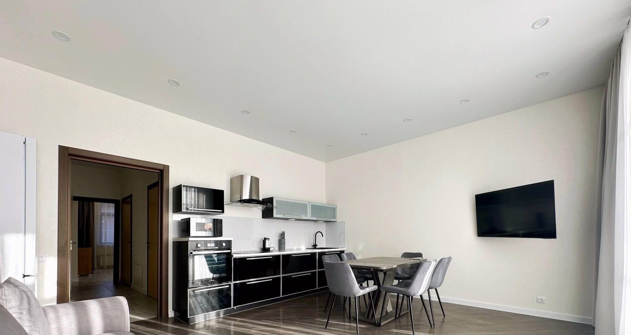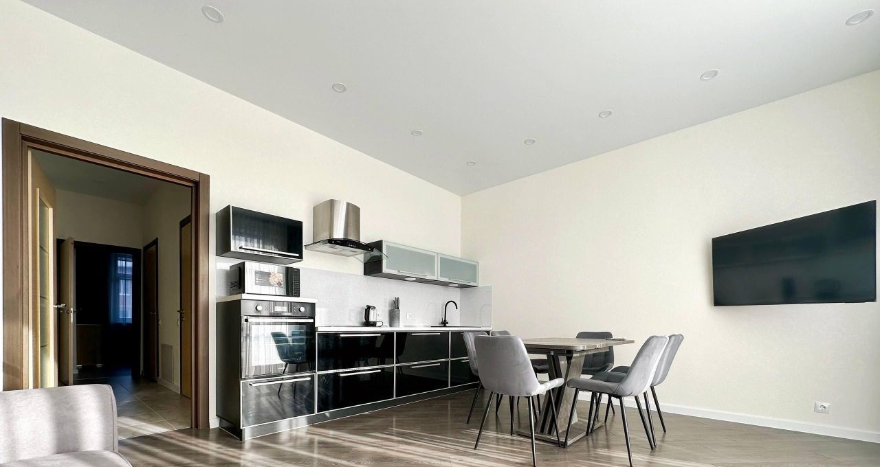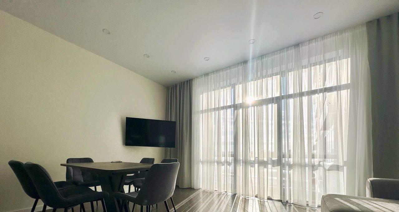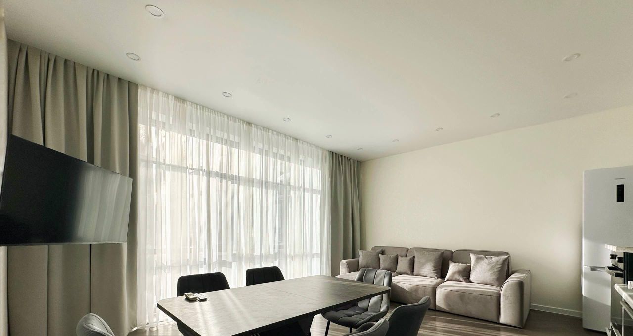 В квартире есть всё необходимое для комфортного проживания: кондиционер, холодильник, посудомоечная машина, телевизор и стиральная машина. Продуманная планировка включает совмещенный санузел с ванной и балкон с видом во двор. Мебель установлена как на кухне, так и в комнате, обеспечивая уют и удобство.