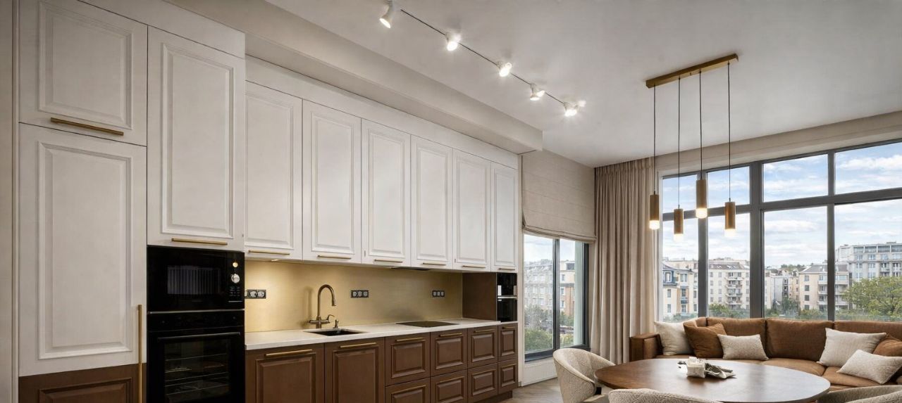 В квартире сделан дизайнерский ремонт, что придаёт ей особый стиль и уют. Просторная кухня в 15 кв. м оснащена всей необходимой мебелью и техникой: кондиционер, холодильник, посудомоечная машина и стиральная машина. В гостиной и спальне также есть удобная мебель. Просторный совмещенный санузел оснащен как душевой кабиной, так и ванной, поэтому можно выбирать, что больше по душе. Две лоджии добавляют дополнительное пространство для отдыха.
