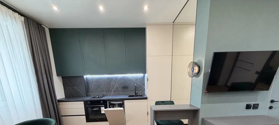 В квартире есть все необходимое для комфортного проживания: современная мебель как на кухне, так и в жилой комнате, а также полный набор техники, включая посудомоечную машину, кондиционер, холодильник, стиральную машину и телевизор. Санузел совмещенный, оборудован ванной.