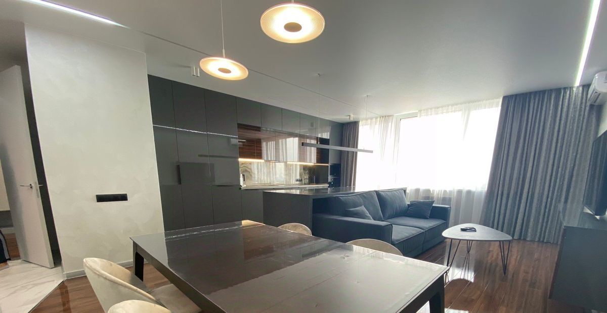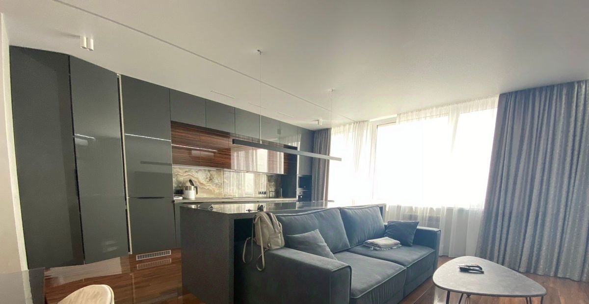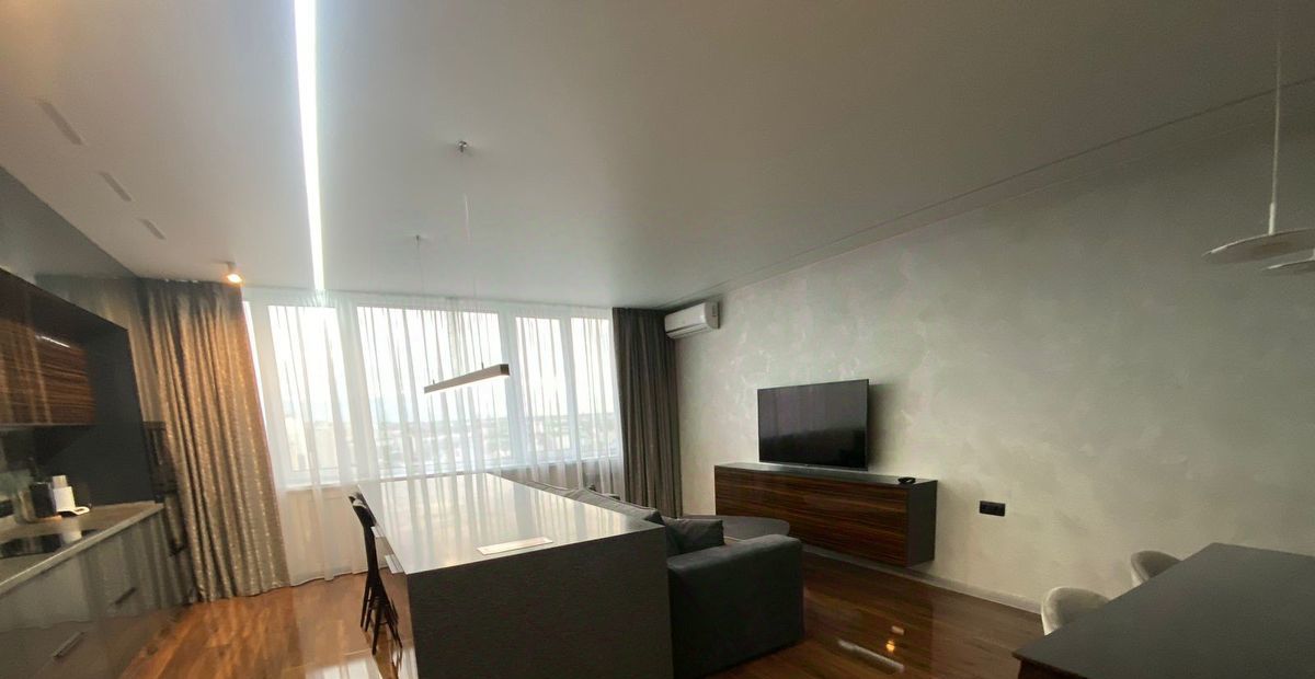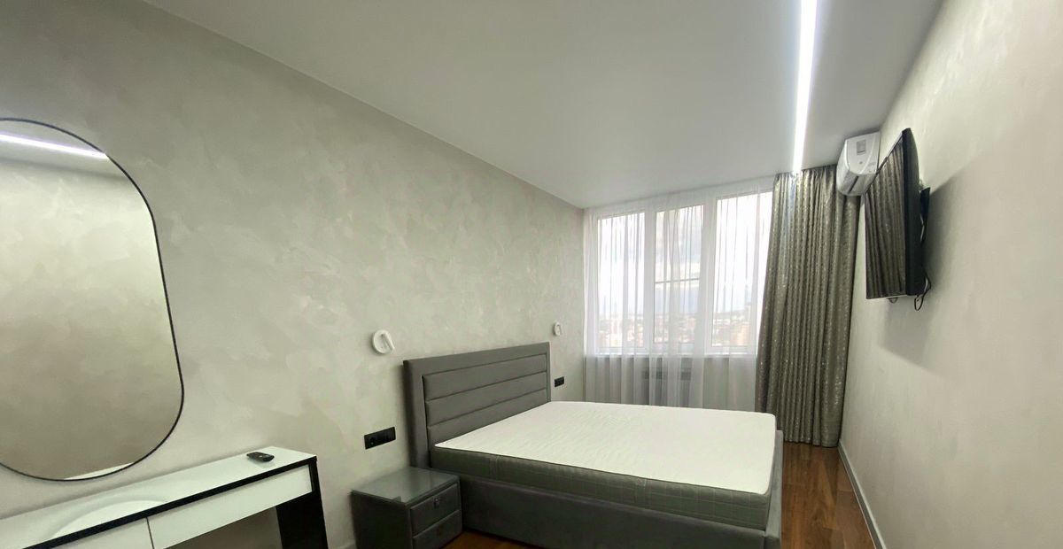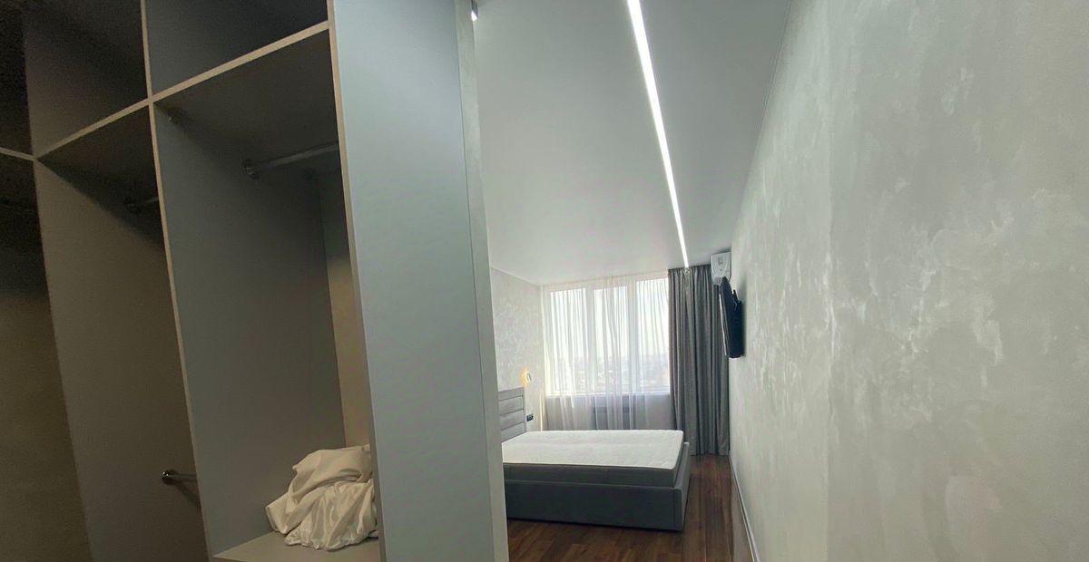 Новая мебель и техника. Выполнен современный дизайнерский ремонт, 2 гардеробные, система хранения вещей, 2 санузла, тёплый пол. Красивый вид на город.