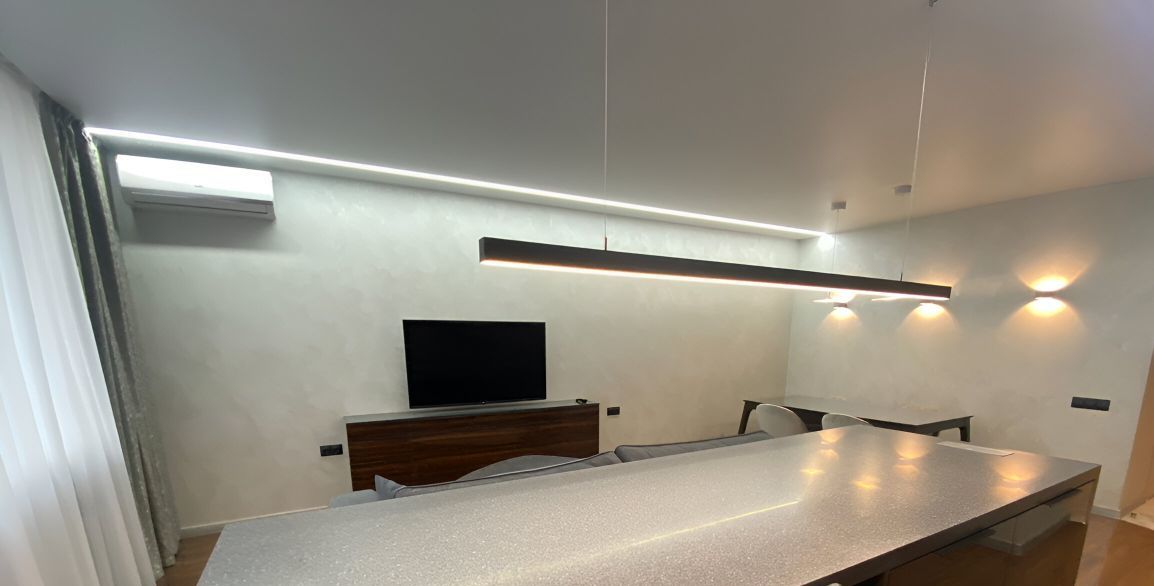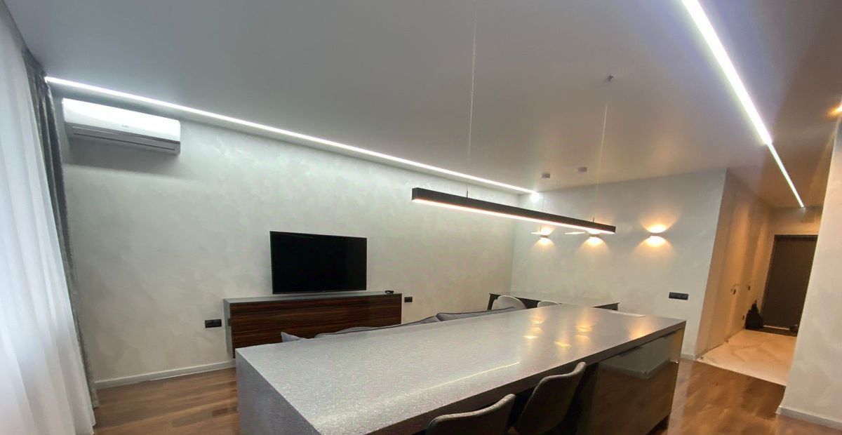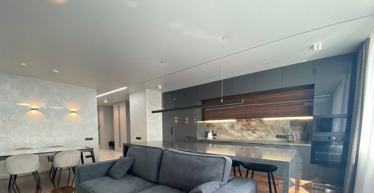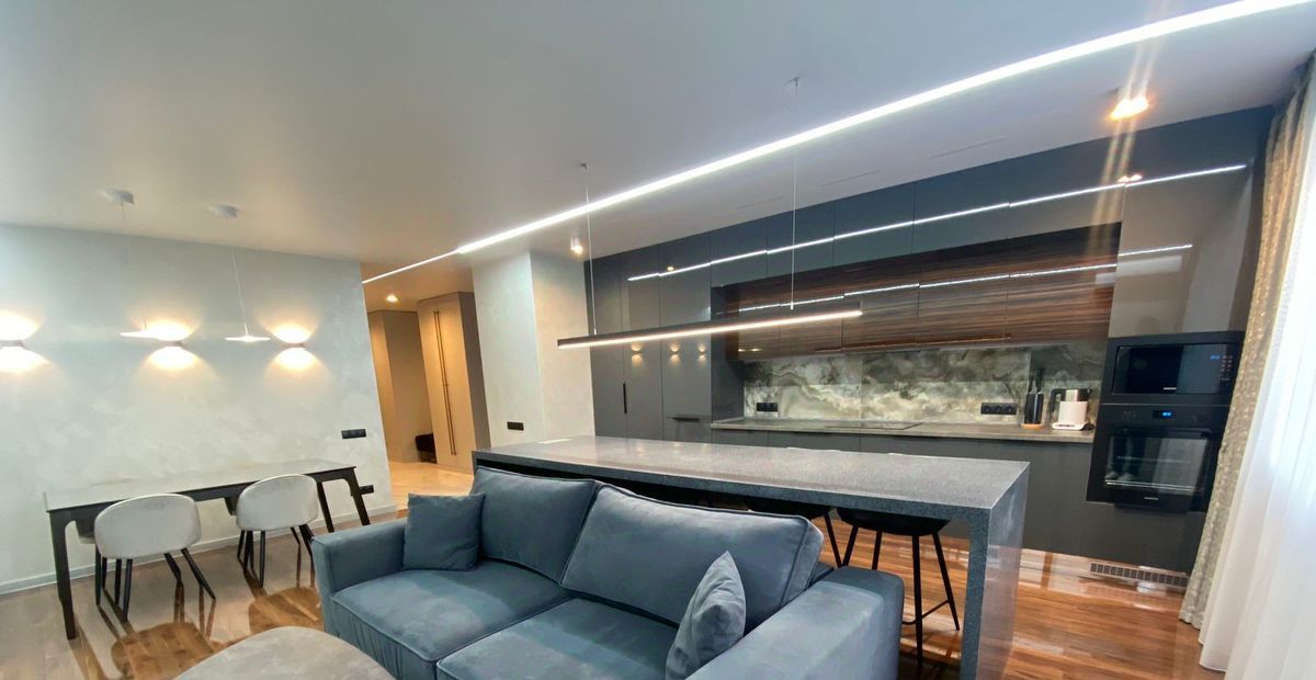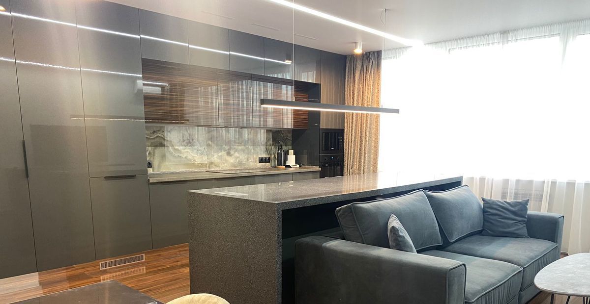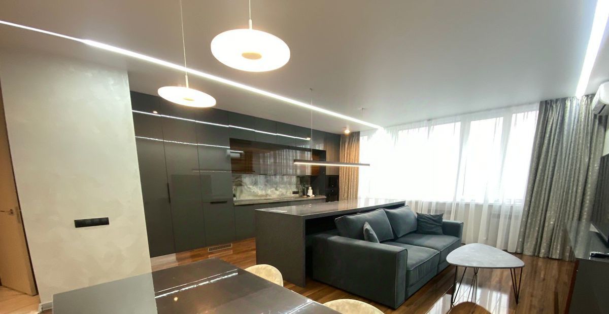 Новая мебель и техника. Выполнен современный дизайнерский ремонт, 2 гардеробные, система хранения вещей, 2 санузла, тёплый пол. Красивый вид на город.
