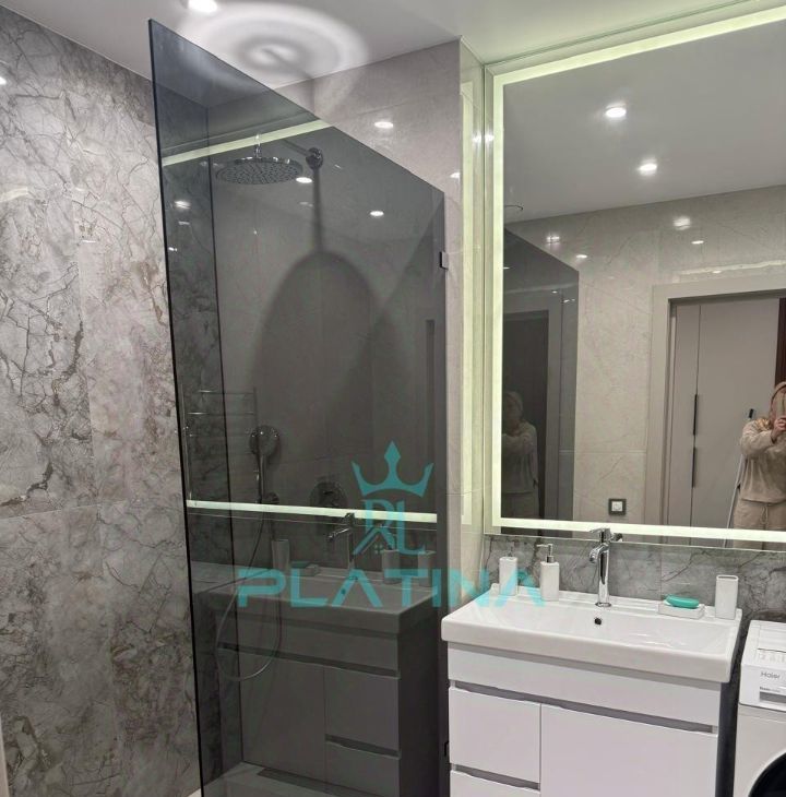 Санузел выполнен в стиле минимализма, оснащен душевой кабинкой и всеми необходимыми удобствами.