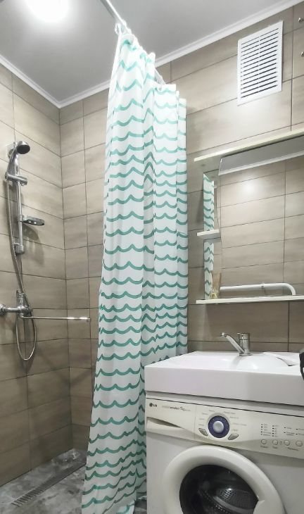 Санузел: современная душевая кабина и стиральная машина.