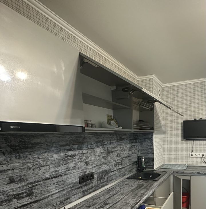 Обставлена мебелью- широкой двухспальной кроватью, трюмо, раскладывающимся кожаным диваном, креслами тоже кожаными, современным кухонным гарнитуром, вместительным шкафом-купе.
