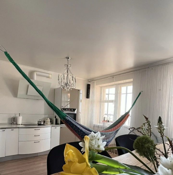 Из окон открывается ошеломляющая панорама, ежедневная эстетика жизни — зеркальная гладь озера Кабан, водная ширина Волги и вечерние огни мегаполиса. В гостиной можно растянуть гамак для занятий йогой и расслабления в любое время дня.