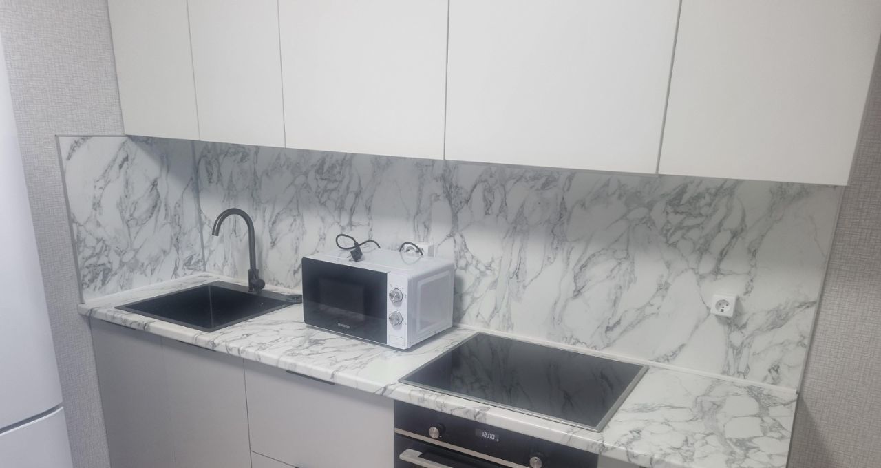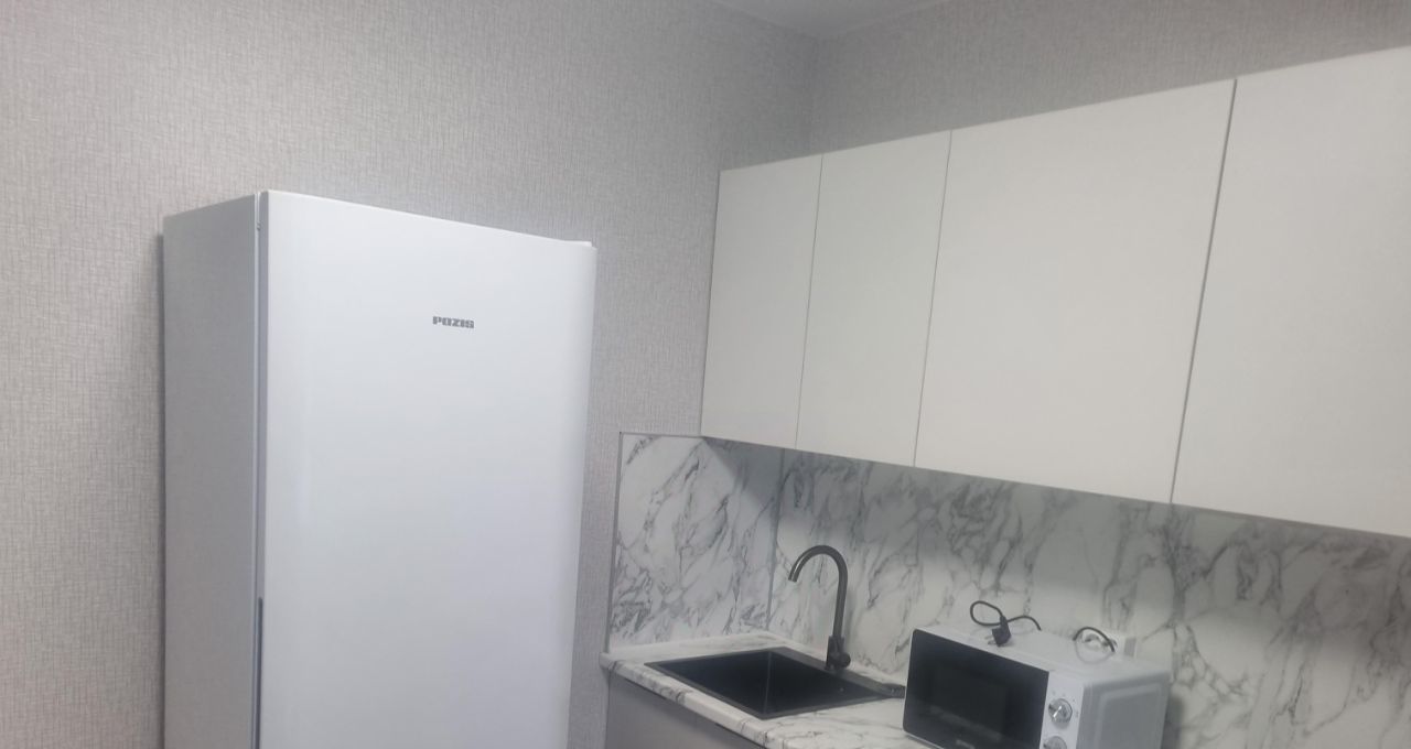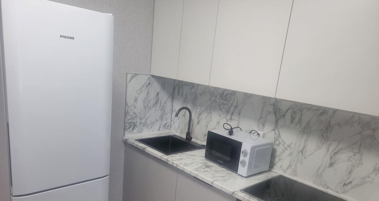 Кухня площадью 12 м² оборудована современной техникой, включая холодильник и микроволновую печь. Ванная комната светлая и аккуратная, оснащена ванной и стиральной машиной.