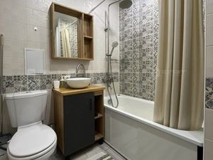 В квартире сделан качественный ремонт. Полы: ламинат, плитка. Окна: пластиковые. Потолки: натяжные. Сан. узел в кафеле. Есть балкон.