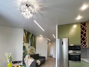 В квартире есть всё необходимое для комфортного проживания. Просторная кухня оборудована современной мебелью и бытовой техникой, включая холодильник и стиральную машину. Ванная комната оснащена ванной. Планировка квартиры включает совмещённый санузел, что добавляет удобства.