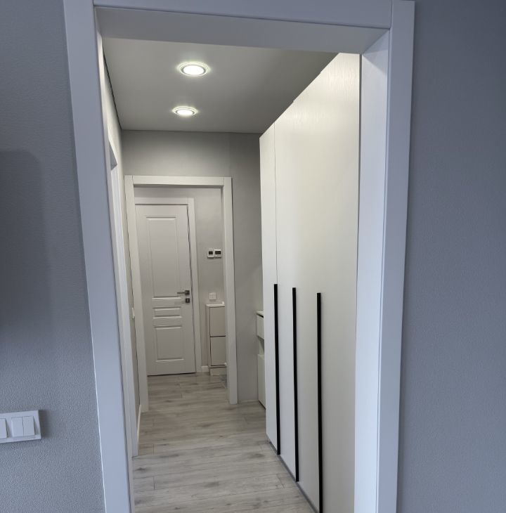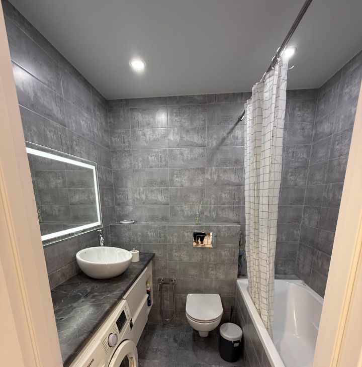 Кухня площадью 8кв оборудована всей необходимой техникой, включая холодильник и стиральную машину. Встроенные шкафы обеспечивают достаточно места для хранения вещей. Ванная комната совмещенная, оформлена в современном стиле с качественной отделкой.