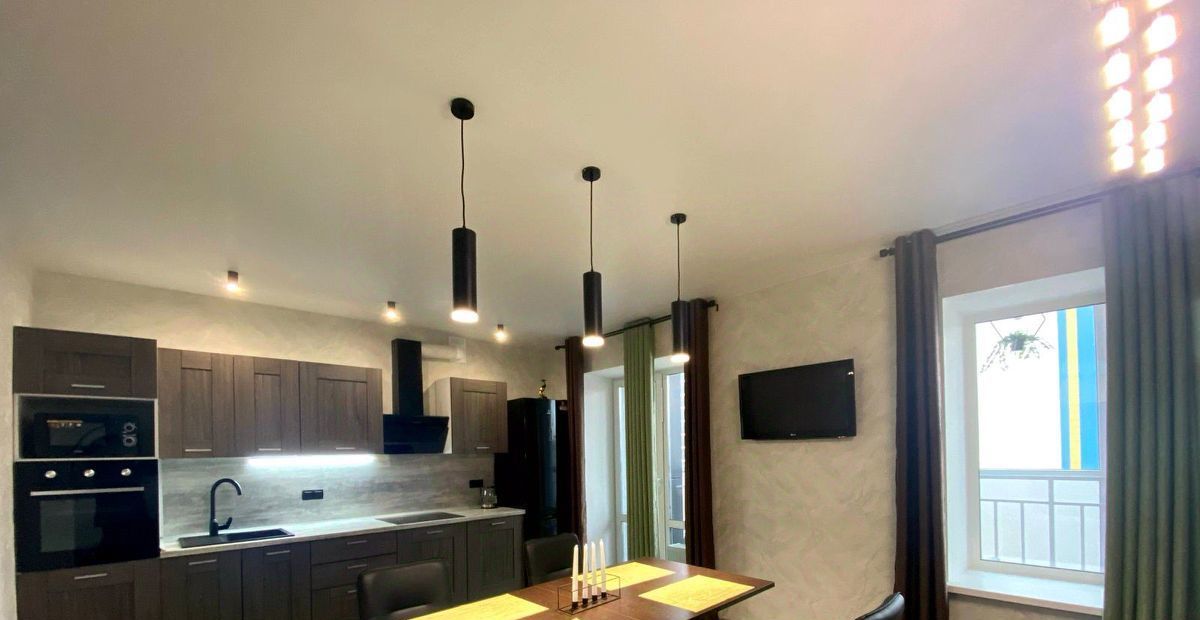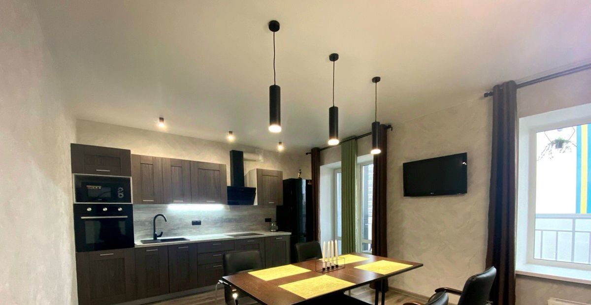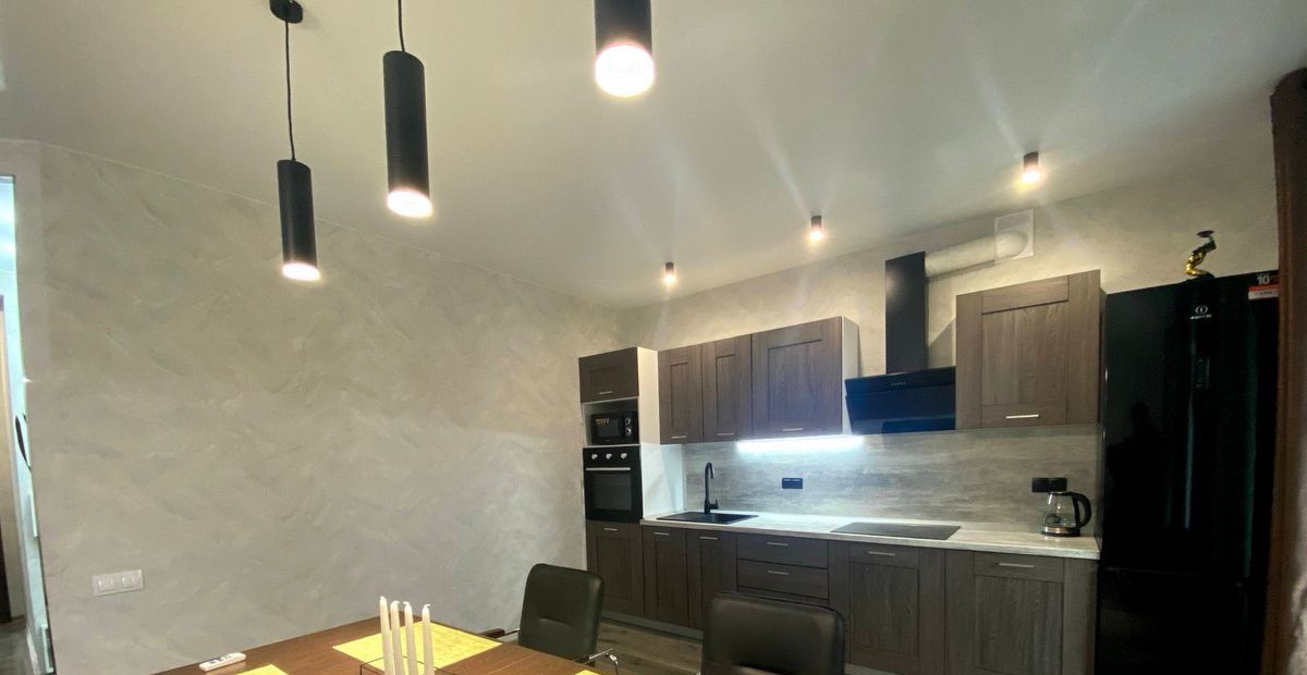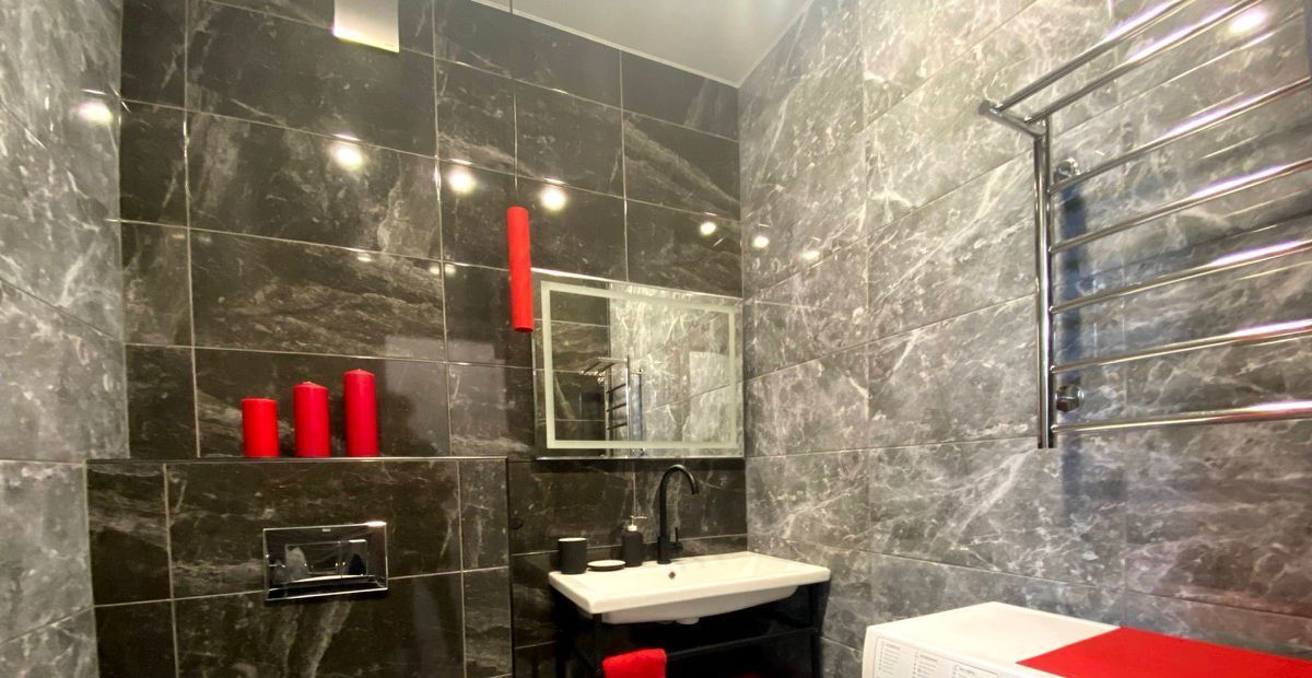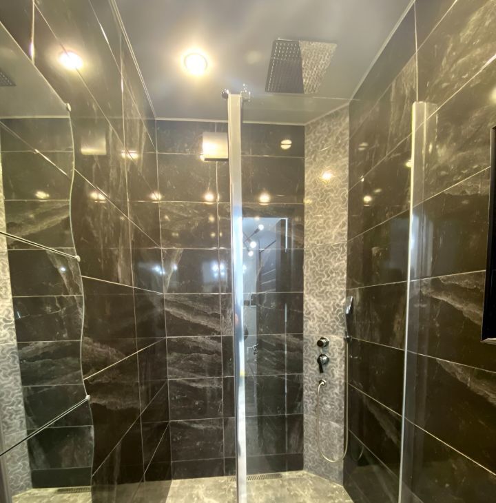 Интерьер выполнен с использованием современных решений, а в комнатах и на кухне есть вся необходимая мебель. Просторная кухня оборудована современной техникой: холодильником, посудомоечной машиной и кондиционером. В ванной комнате есть как душевая кабина, так и ванна, что удобно для любого выбора. В квартире также есть телевизор и стиральная машина.