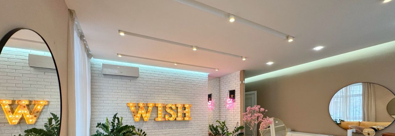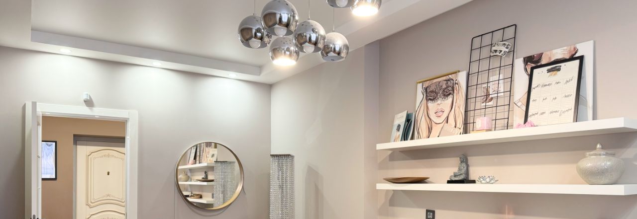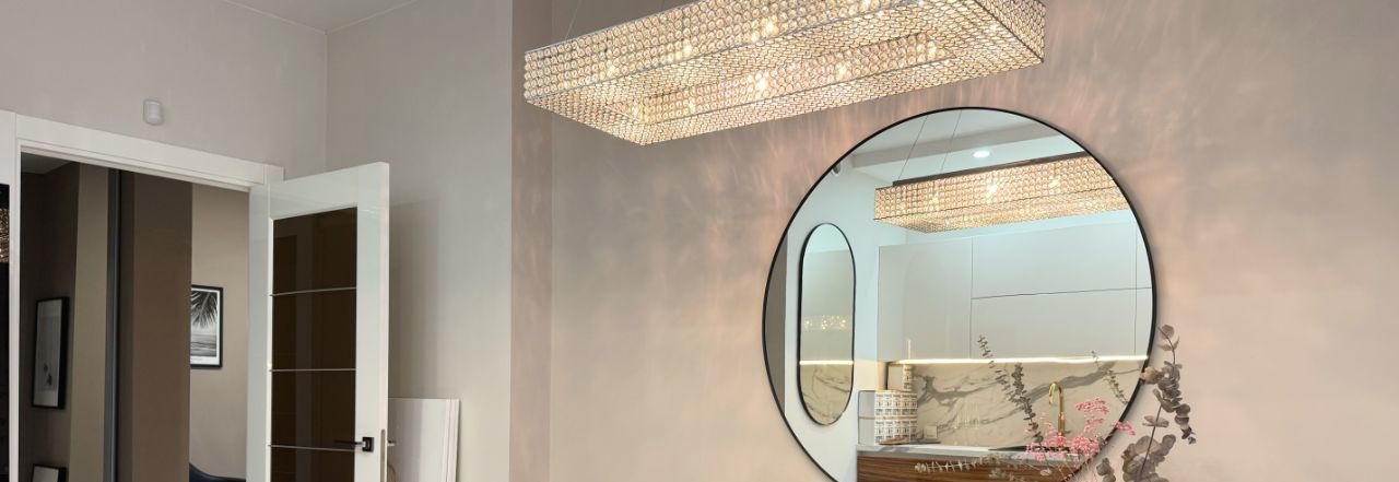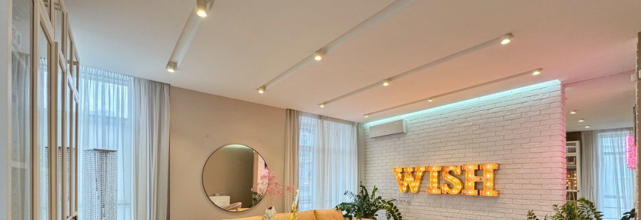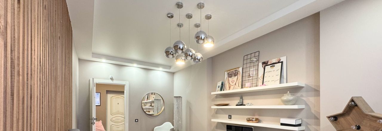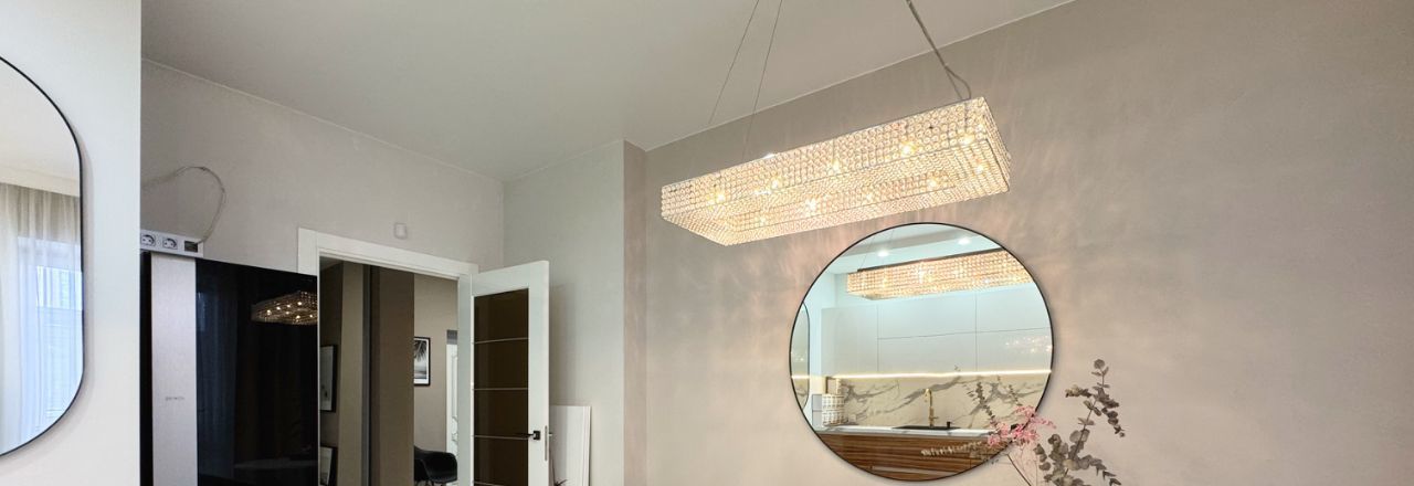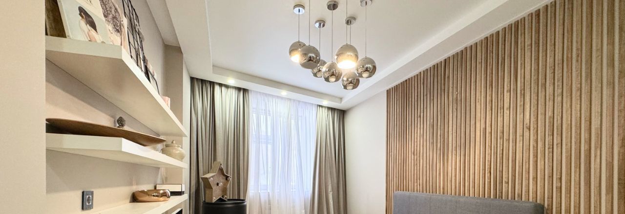 Интерьер оформлен в лаконичных светлых тонах и украшен дизайнерскими светильниками .