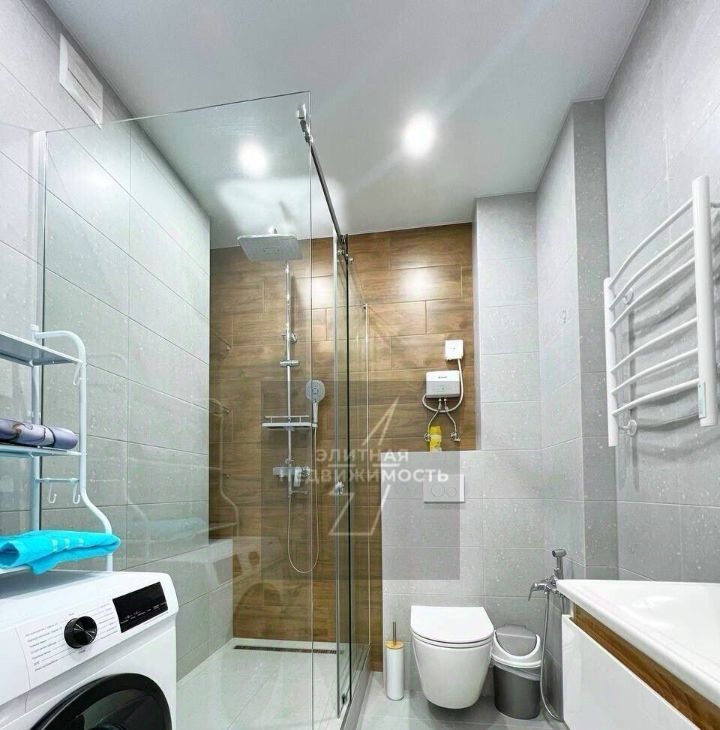Ванная с современной сантехникой и душевой кабиной